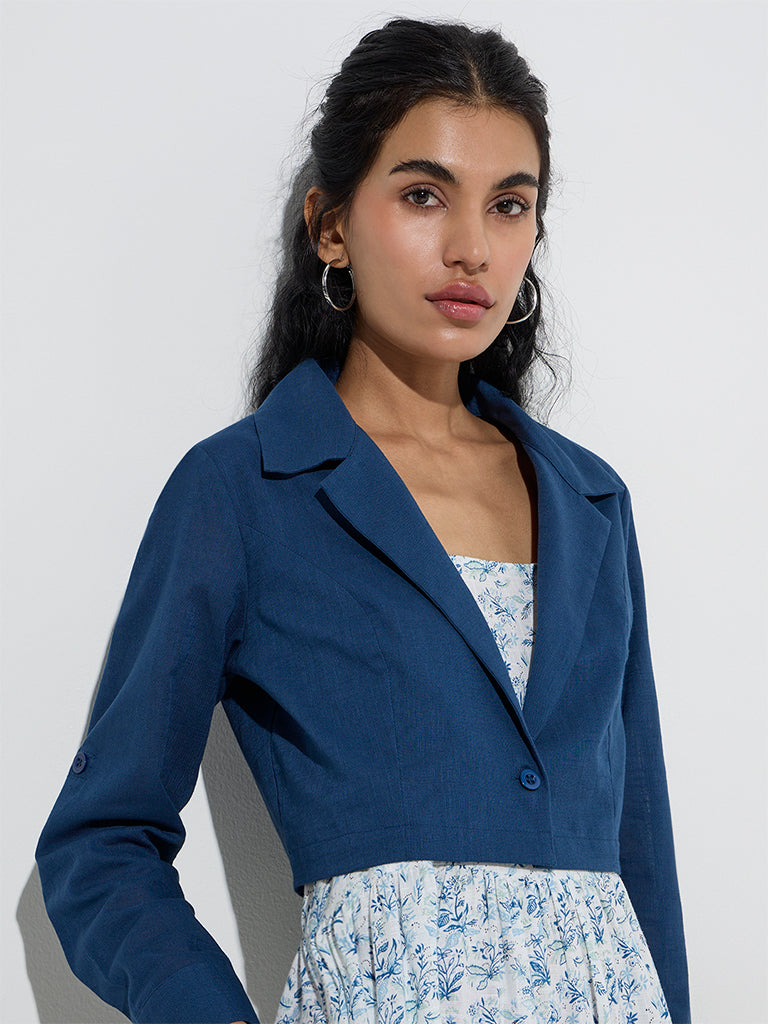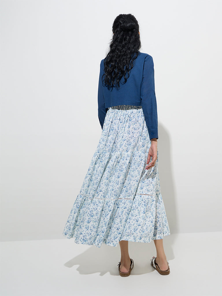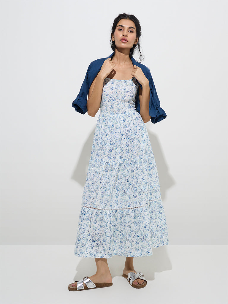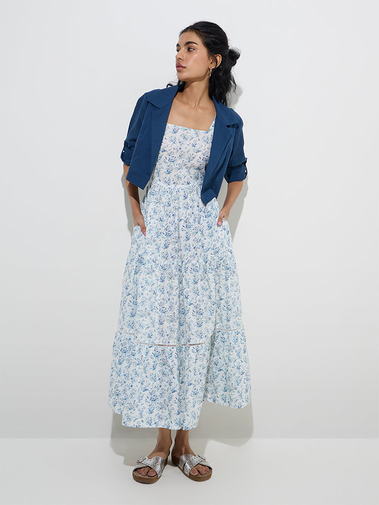 Carved in a tiered silhouette. this indigo dress from Bombay Paisley showcases a delicate floral print for a graceful flair. A square neckline with adjustable shoulder straps and a smocked back ensure a flattering fit. while the cropped jacket completes the look with easy elegance.
