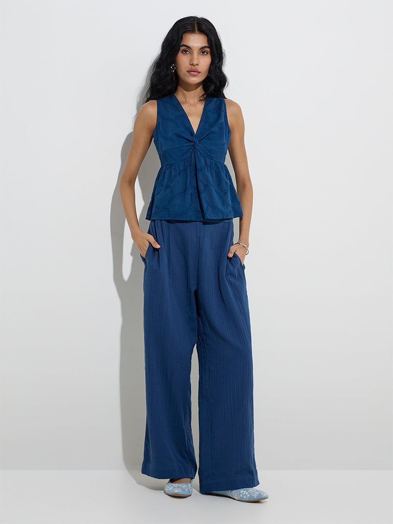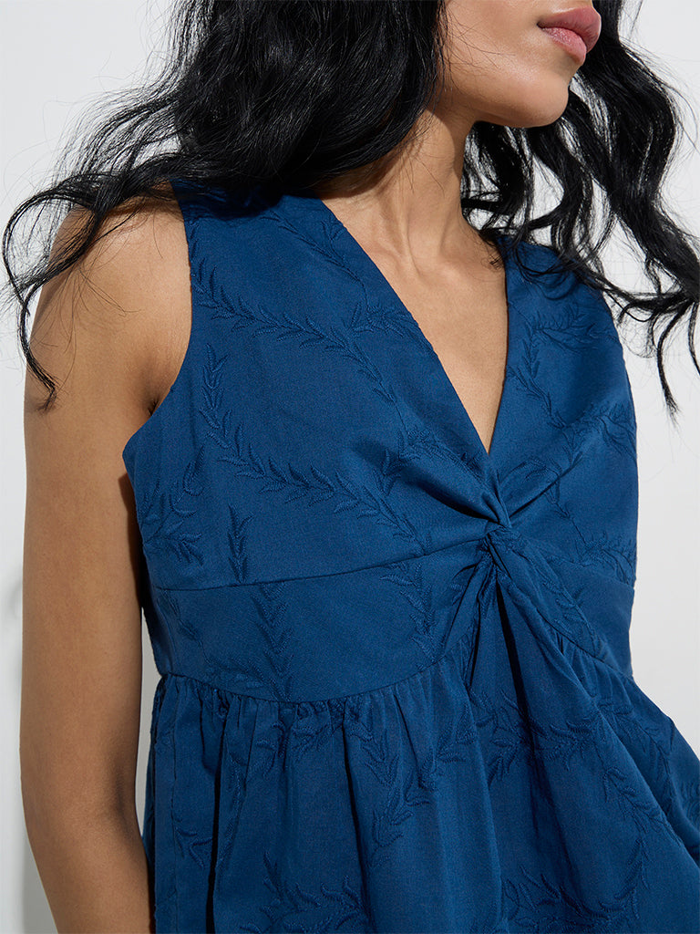 This indigo peplum top by Bombay Paisley is crafted from pure cotton and showcases intricate embroidery for a touch of artisanal flair. The knot-detailed bodice pairs with a V-neck and sleeveless design to create a contemporary silhouette that blends tradition with modern ease.