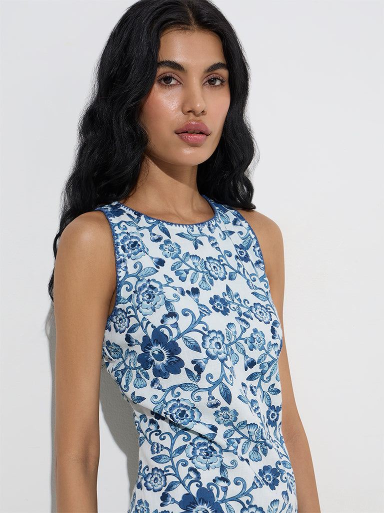This indigo sheath dress from Bombay Paisley flaunts all-over floral motifs and is crafted from pure cotton. It features a classic round neckline and a sleeveless cut for a clean. timeless look.