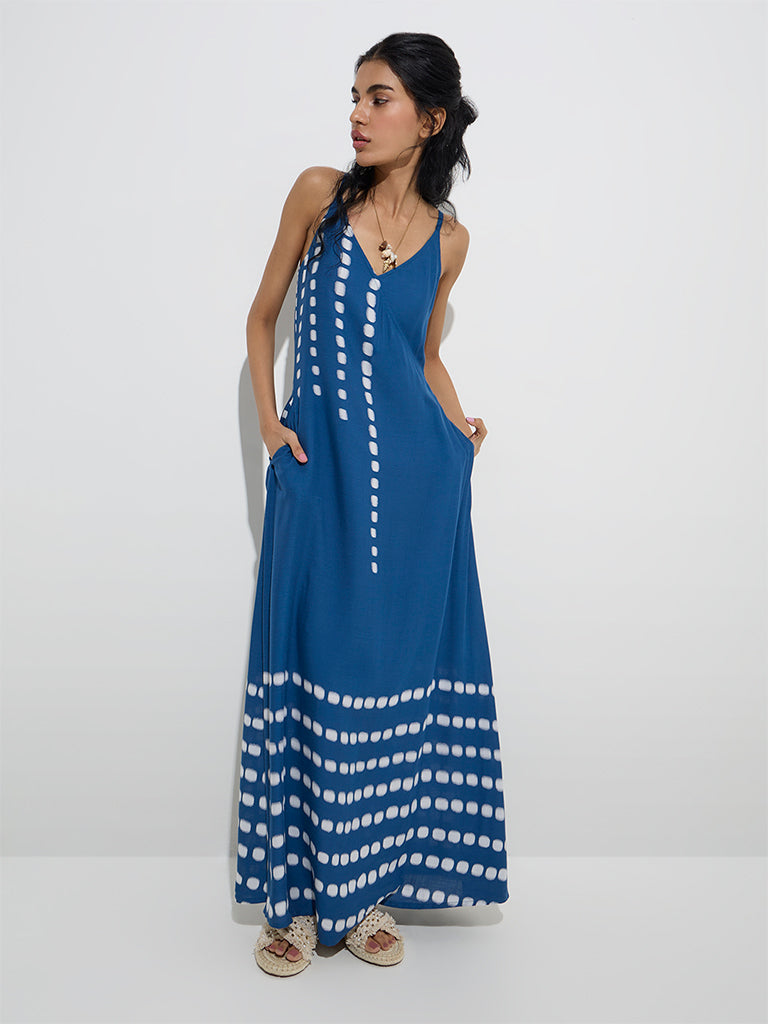 This indigo dress from Bombay Paisley is fashioned with a geometric print that creates an eye-catching visual rhythm. Milled from a lightweight fabric. it’s designed with a plunge neck. adjustable straps. and practical side pockets for everyday ease.