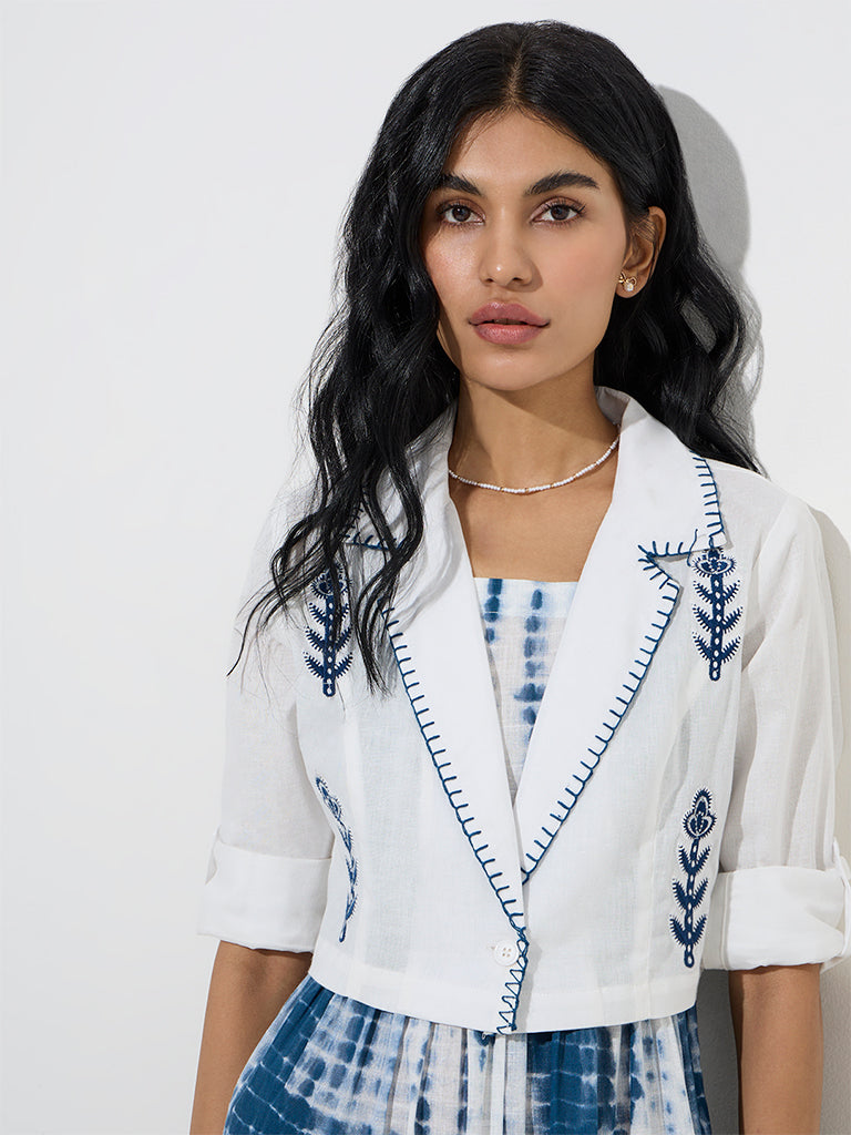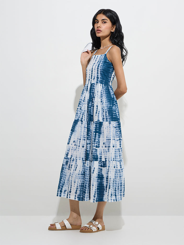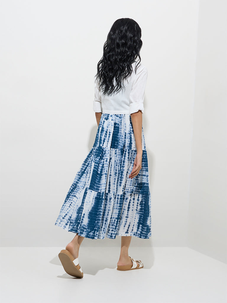 Embrace effortless style with this indigo tie and dye A-line dress from Bombay Paisley by Westside. Made from pure cotton. it features a tiered design. square neckline. and adjustable shoulder straps for a comfortable fit. The dress comes with a chic white crop jacket adorned with embroidered detailing. notched collar. and full sleeves. secured with a button. making it perfect for layering.