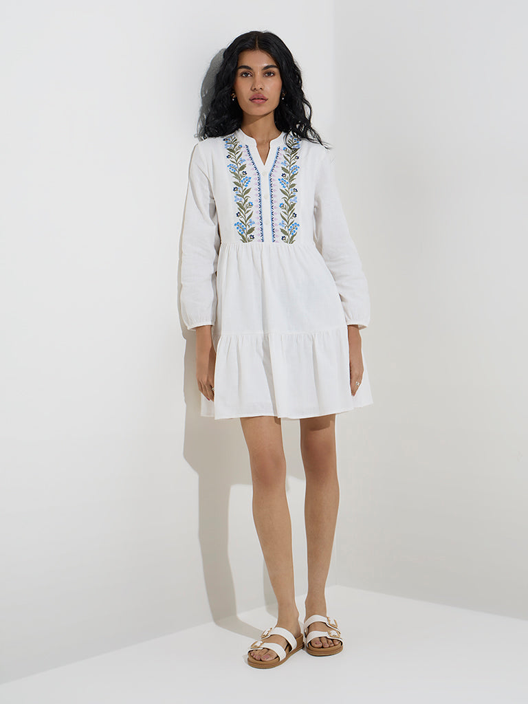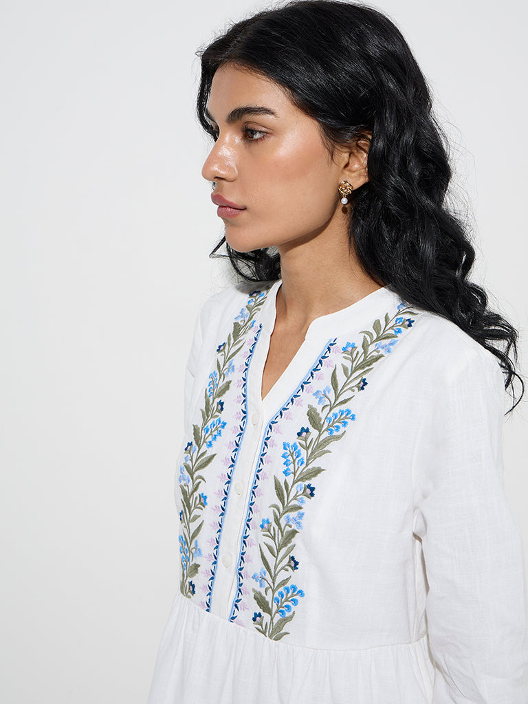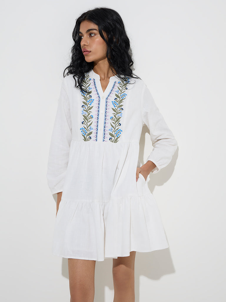 Embrace effortless elegance with this ivory dress from Bombay Paisley. Spun from pure cotton in a tiered silhouette. it showcases intricate floral embroidery that brings a feminine charm. A mandarin neck with a button placket and blouson sleeves round off the design with graceful ease.