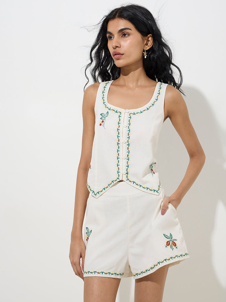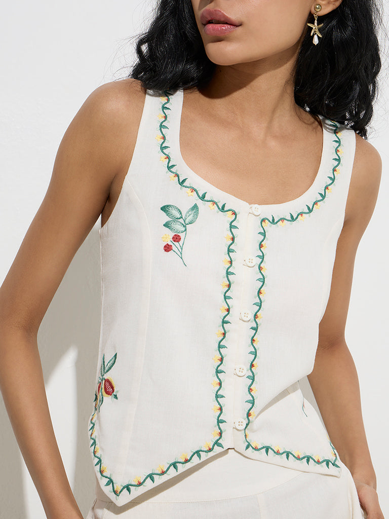 This ivory vest top from Bombay Paisley is adorned with delicate botanical embroidery that lends it a charming touch. Spun from a sumptuous cotton-linen blend. it’s designed in a sleeveless silhouette with a scoop neck and a button placket for easy wear.