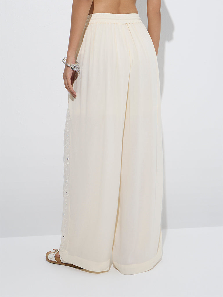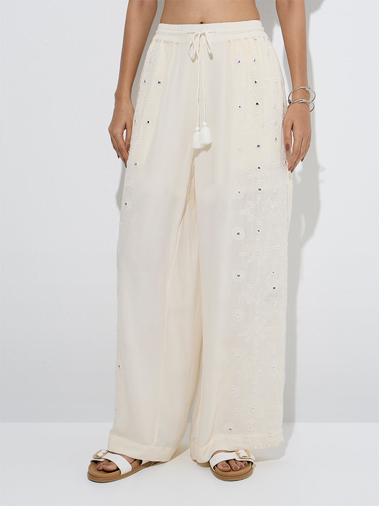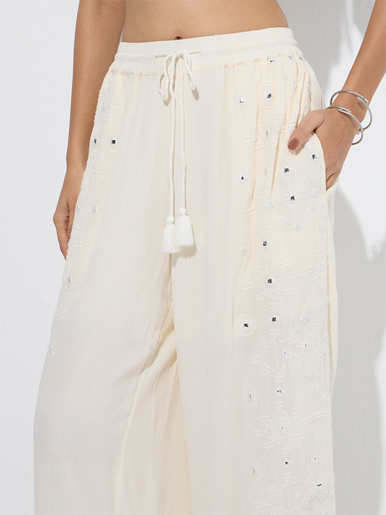 Bombay Paisley Ivory Mirror Work Detailed Cotton Palazzos