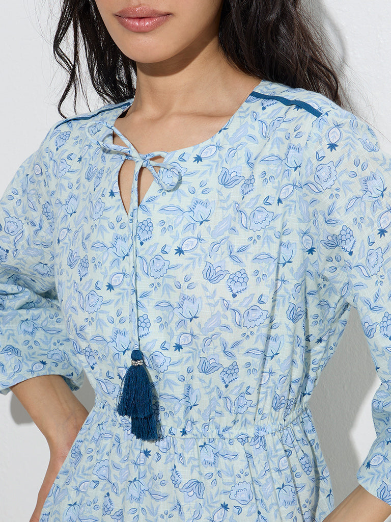 Bombay Paisley introduces this light blue dress. adorned with delicate floral patterns for a feminine touch. Woven from pure cotton. it features a flattering fit-and-flare silhouette with an elasticated waist for a cinched look. A split neckline with tasselled drawstrings and peasant sleeves add to its effortless charm.