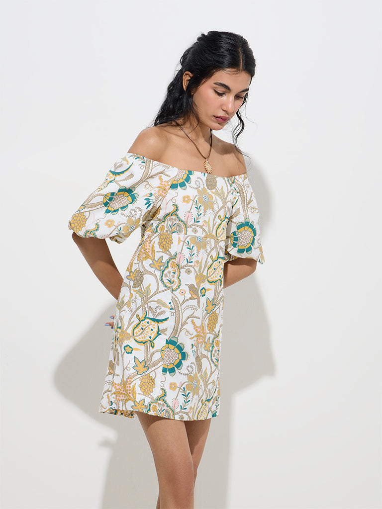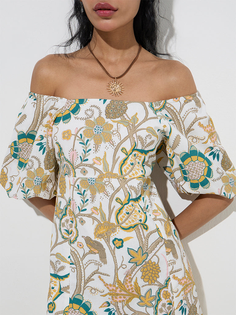 This multicolour dress from Bombay Paisley is fashioned with vibrant foliage patterns on a premium cotton-linen blend fabric. Sculpted in an A-line silhouette. it features an off-shoulder neckline with blouson sleeves. while the smocked back ensures a comfortable and flexible fit.