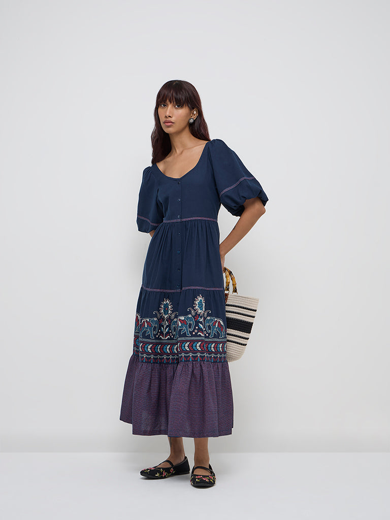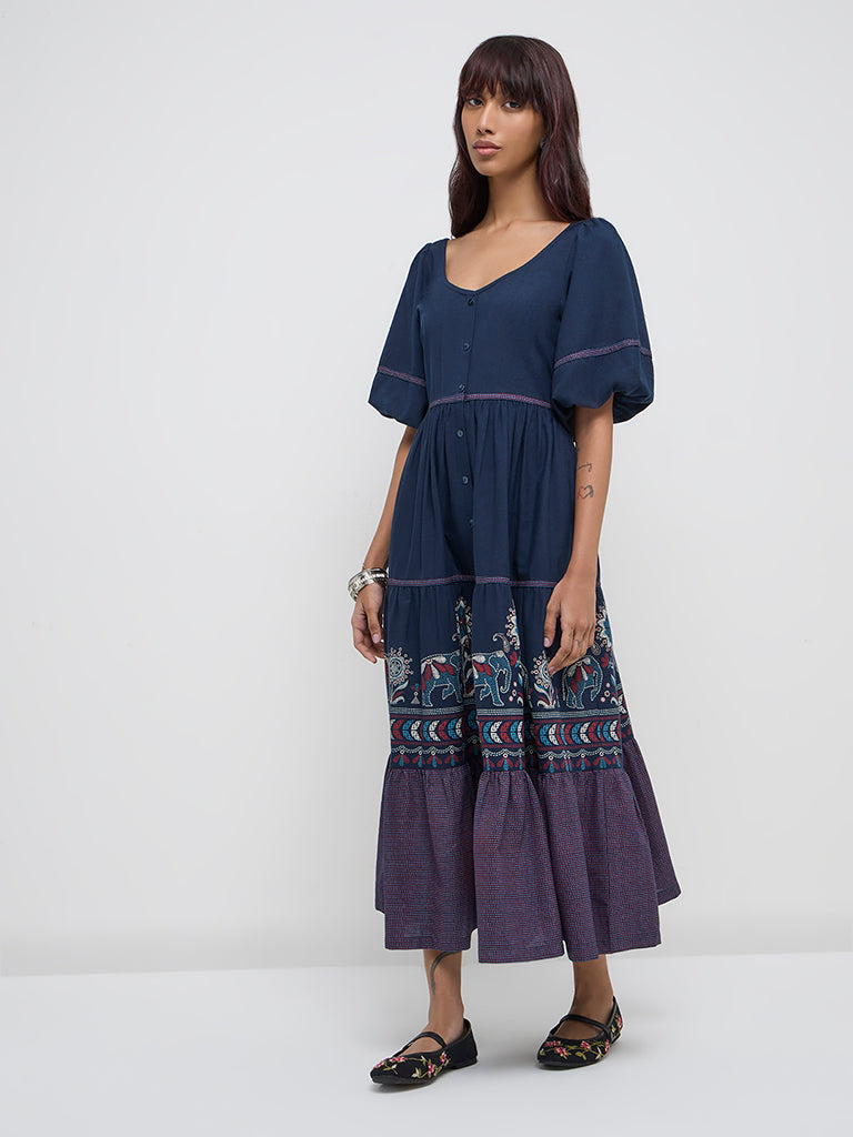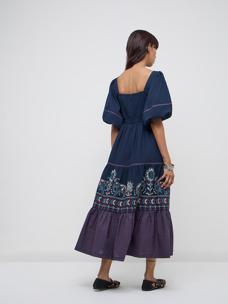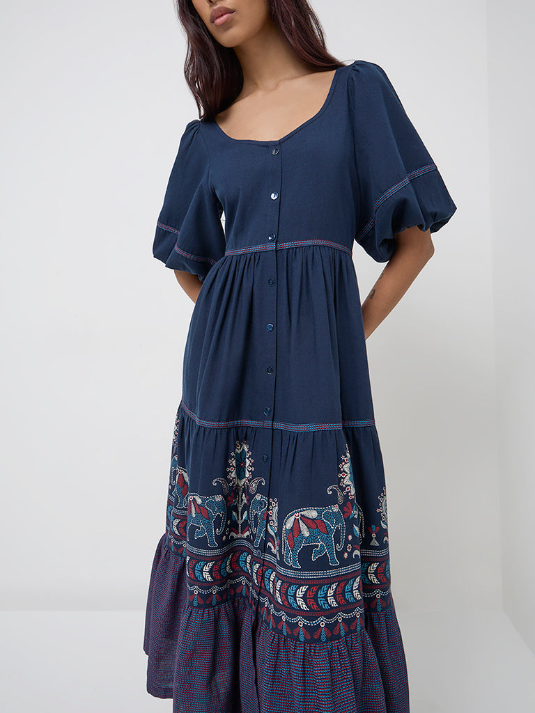 This navy dress by Bombay Paisley showcases elephant motifs. Crafted from a lightweight fabric in a tiered silhouette. it is designed with a V-neck which extends to a button placket and puff sleeves. The smocked back ensures easy wearability.