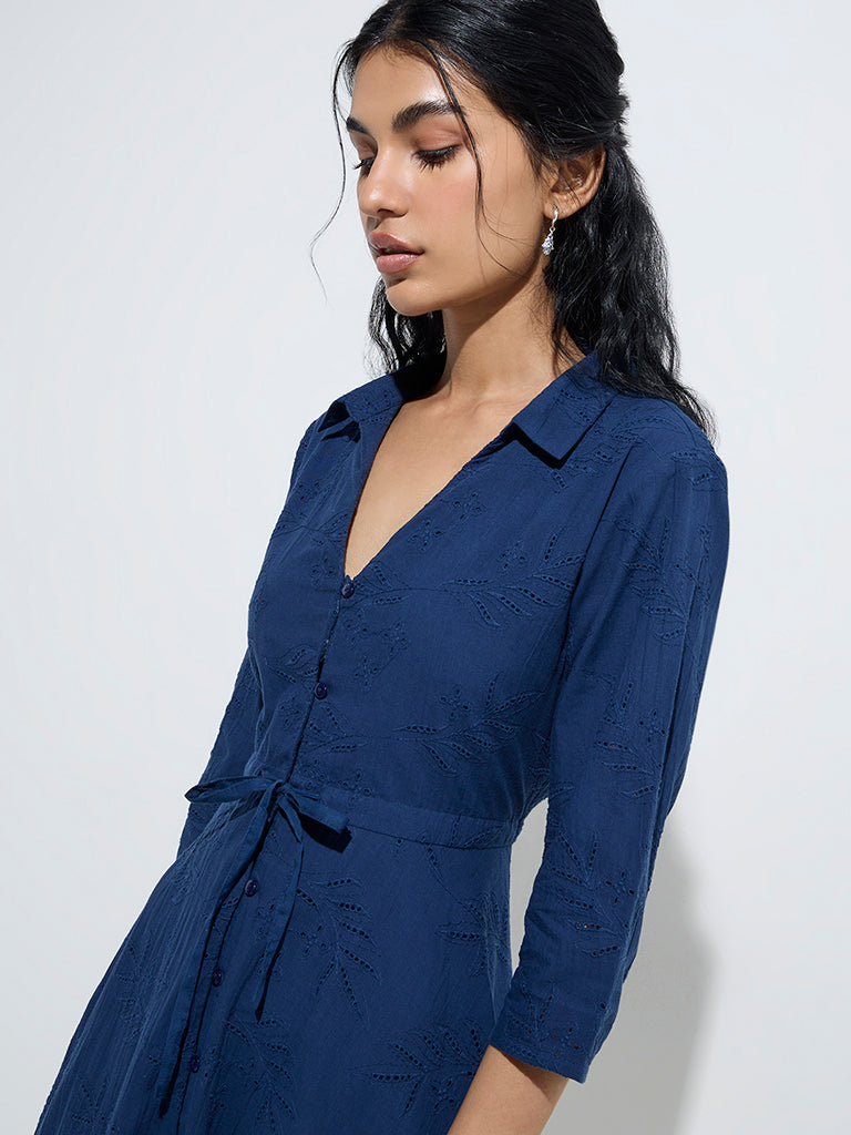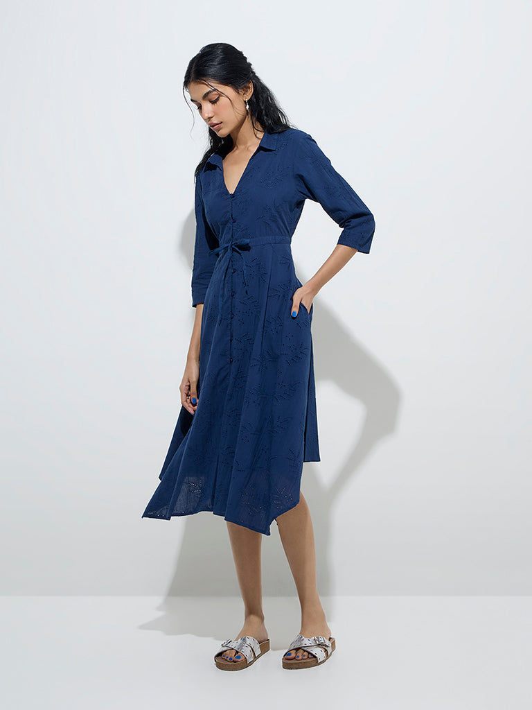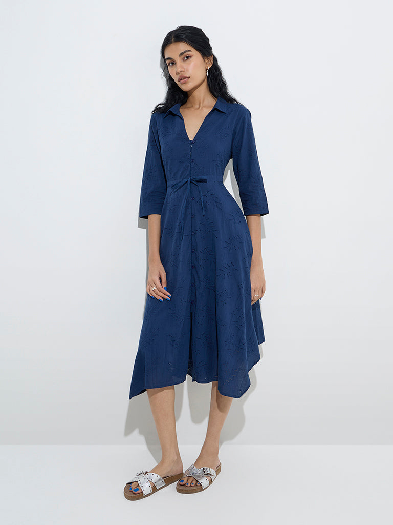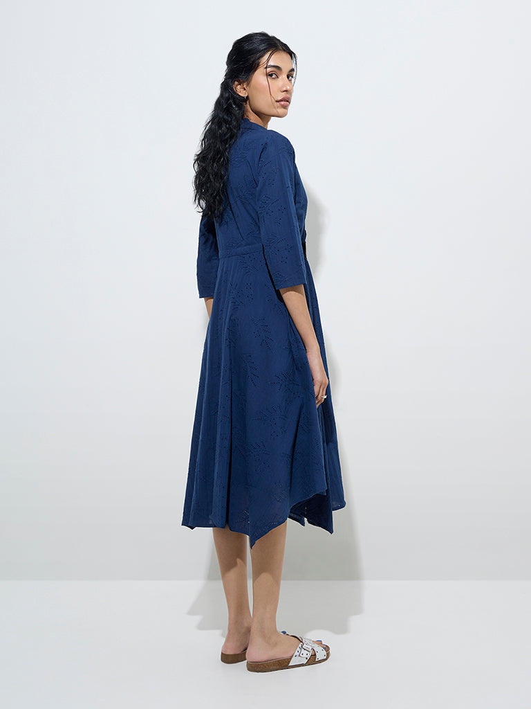 Bombay Paisley presents this navy dress. exquisitely crafted from pure cotton with intricate embroidery. Designed in a flattering A-line silhouette. it features a V-neckline. a button-down front. and three-quarter sleeves. A tie-up at the waist enhances the fit. while the asymmetrical hemline adds a contemporary flair.