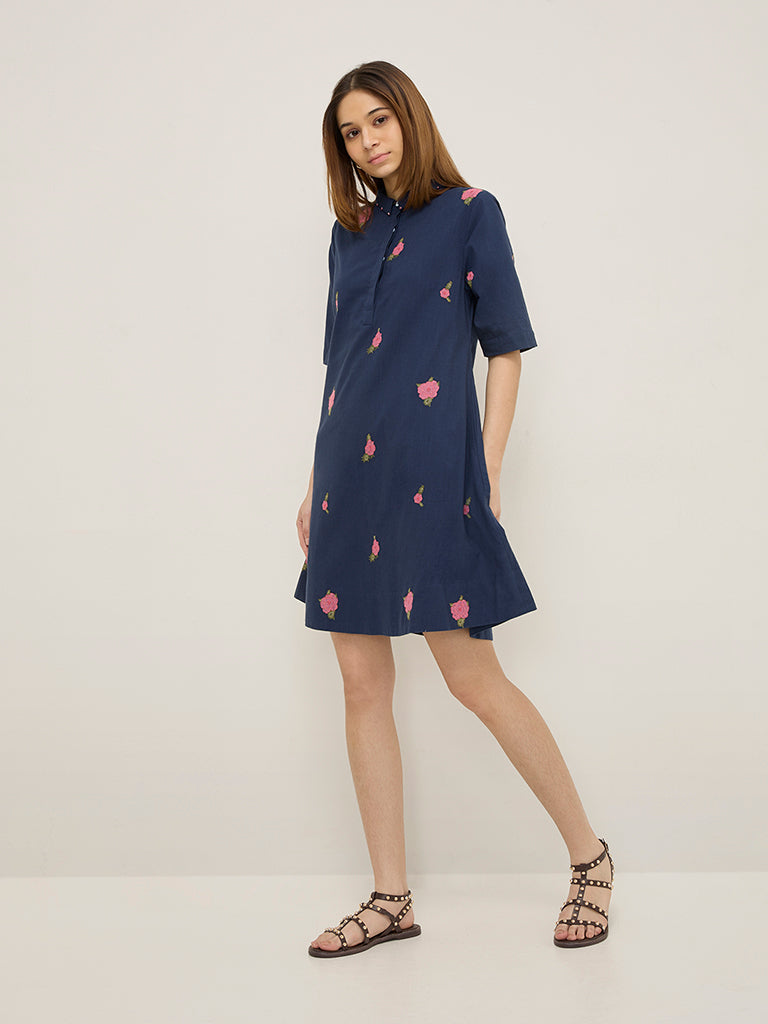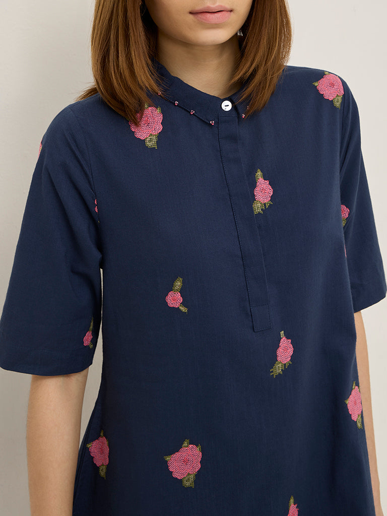 This navy shirt dress from Bombay Paisley is adorned with floral embroidery. Milled from a cotton-rich fabric. it comes fitted with a collar that extends to a concealed button placket and half sleeves.