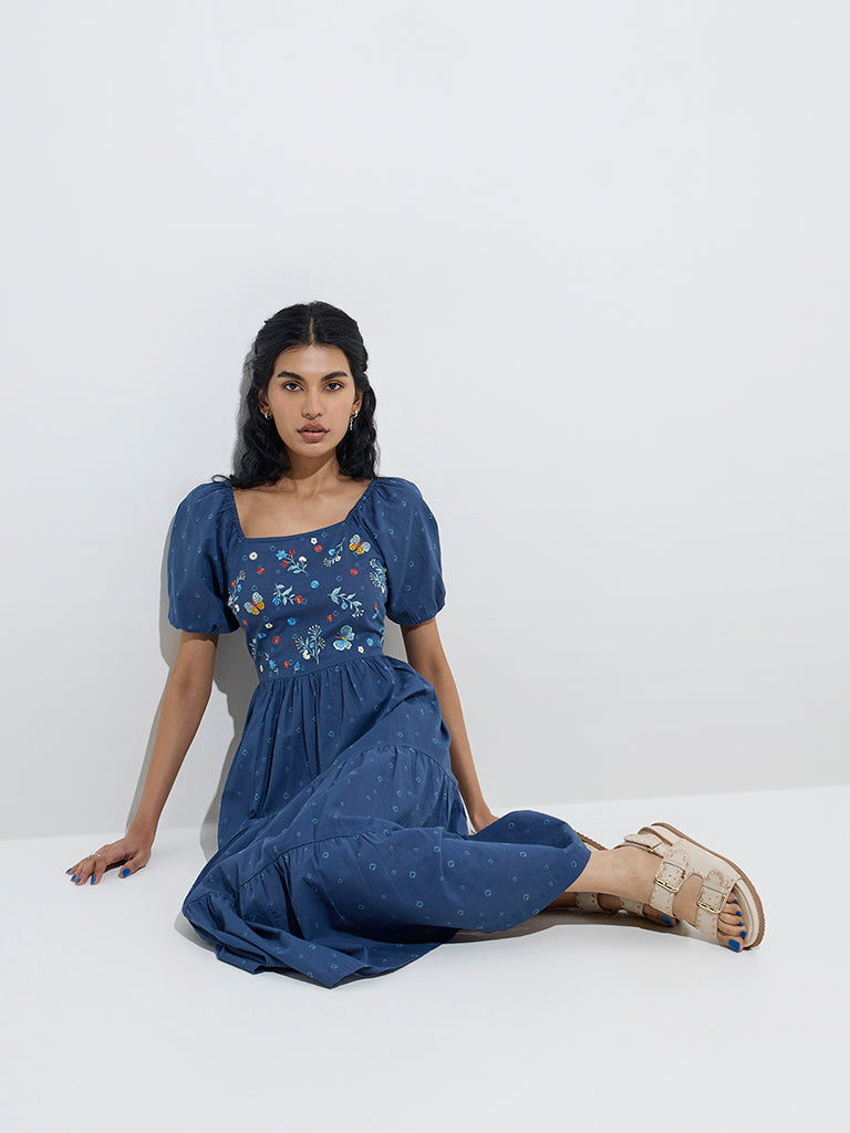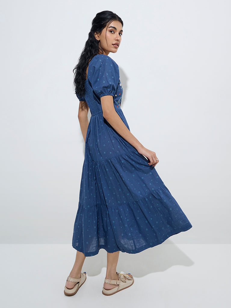 Bombay Paisley Navy Floral Embroidered Cotton Tiered Dress
