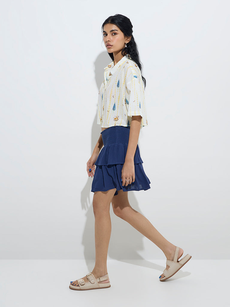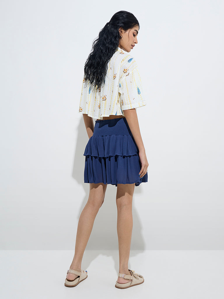 Bombay Paisley introduces this navy skirt. designed with a tiered silhouette for a playful yet elegant appeal. Featuring delicate ruffles. it is structured with a smocked elasticated waistband for a flattering fit.