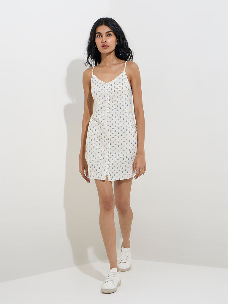 Bombay Paisley introduces this off-white dress decked with intricate botanical prints all over. Designed in an A-line silhouette. this cotton-rich fabric garment is styled with a V-neck with adjustable straps. and a button-up front for easy wearability and finished with functional side pockets.