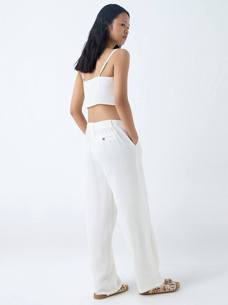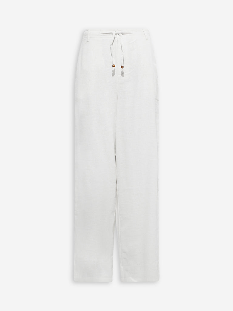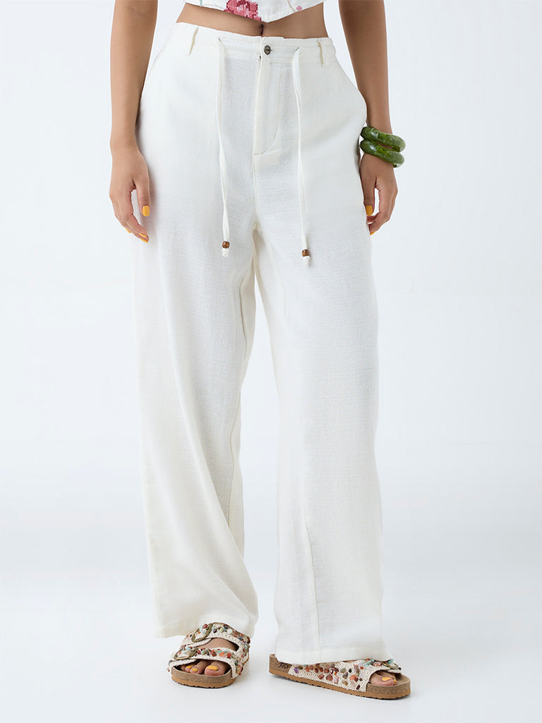 These off-white pants from Bombay Paisley blend everyday ease with understated charm. Woven from a cosy cotton-blend fabric. they feature a clean silhouette with an adjustable drawstring waistband for a comfortable fit. Multiple pockets complete the look with a touch of practical detail.