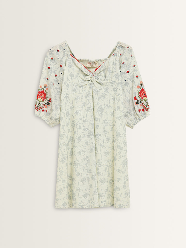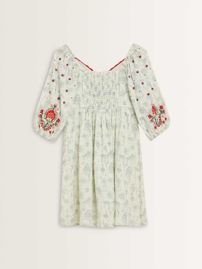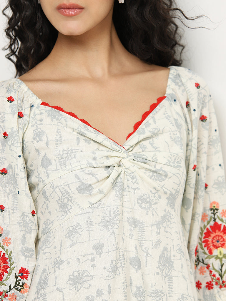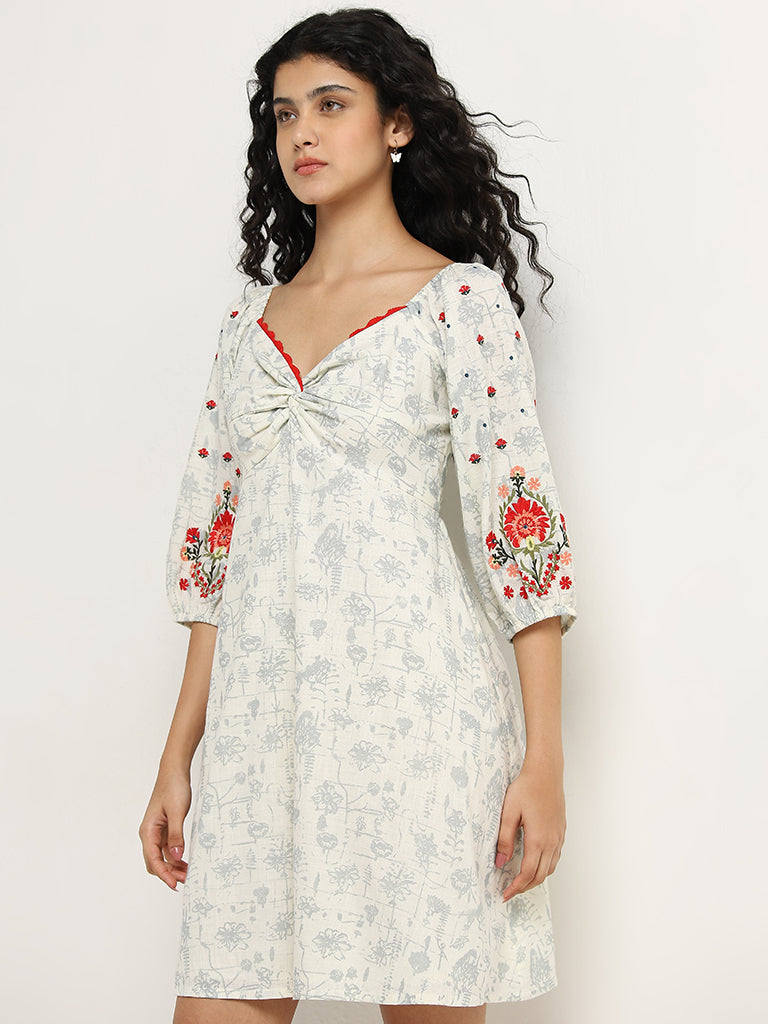 This off-white dress from Bombay Paisley showcases floral embroidery. Designed in an A-line silhouette from breathable fabric. it features a plunge neckline and puff sleeves. Ruched detailing at the bodice adds to its stylish appeal.