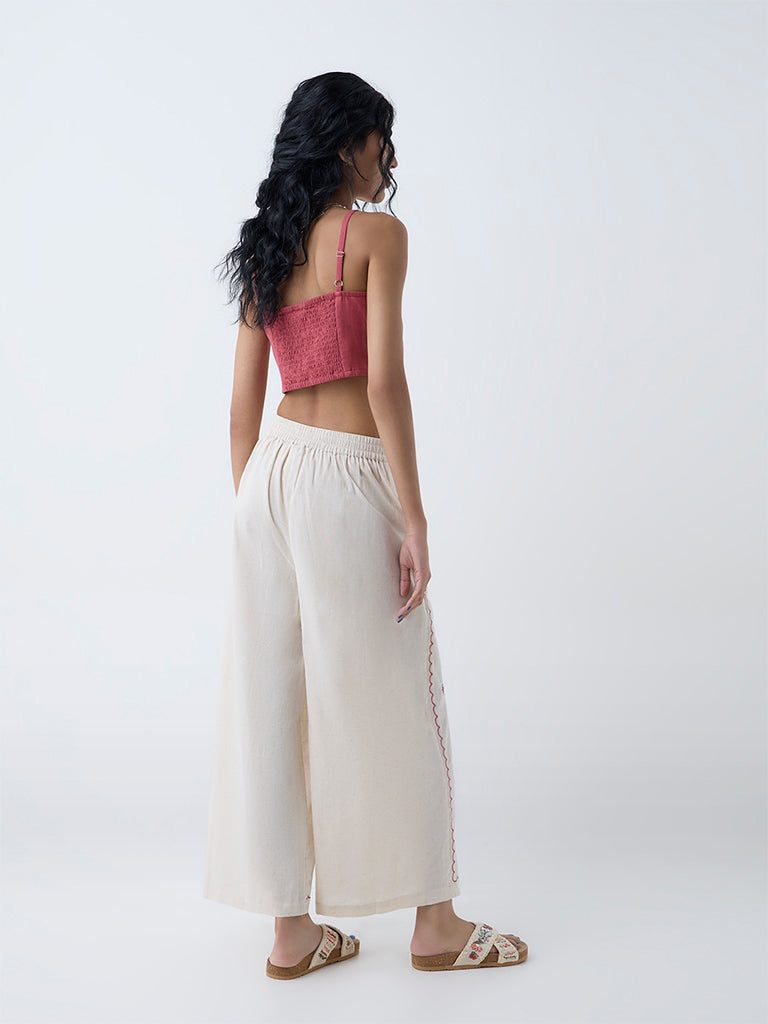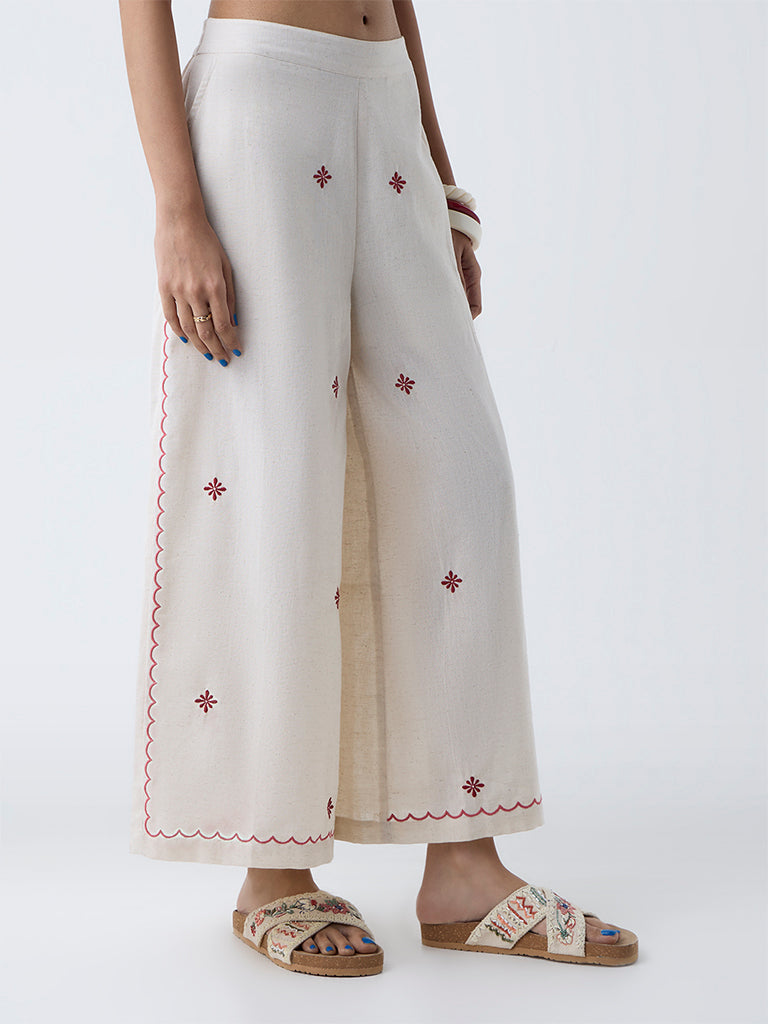 Move through your day with ease and style in these off-white palazzos from Bombay Paisley. Milled from a cotton-rich fabric for daily comfort. they come fitted with an elasticated waistband and side pockets. The delicate floral embroidery throughout accentuates its appeal.
