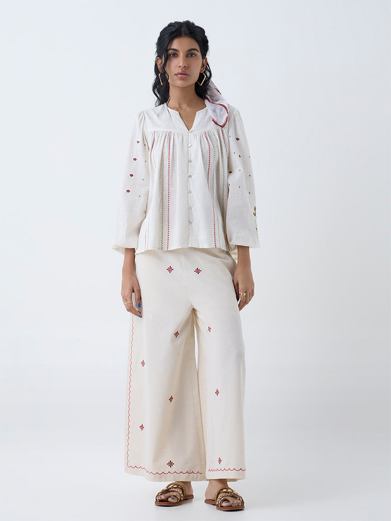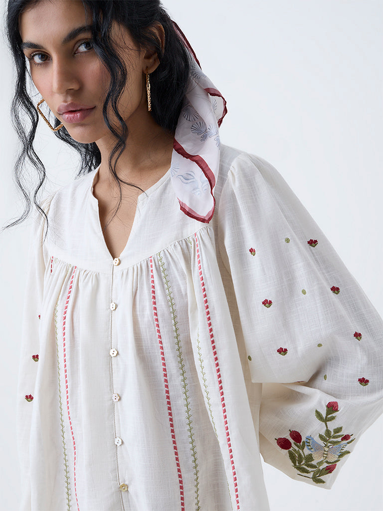 Rev up your summer wardrobe with this off-white top from Bombay Paisley. Designed with a split neck. button placket. and peasant sleeves. it highlights exquisite floral motifs for a feminine touch. Made from pure cotton with embroidered stripes on the front. it’s perfect for effortless daytime wear.