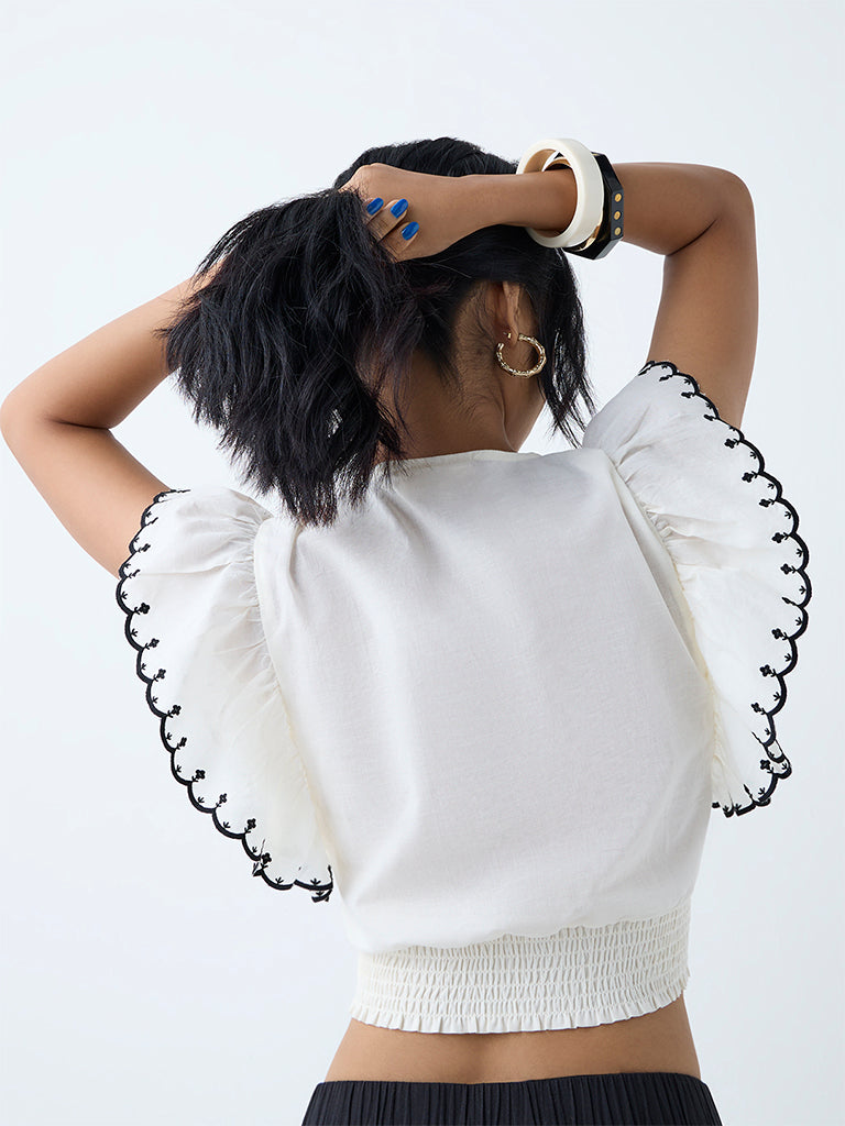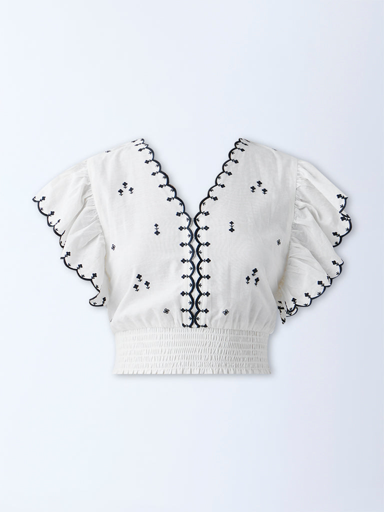 This off-white top from Bombay Paisley captures a breezy charm with its intricate floral embroidery and vintage-inspired angel sleeves. Crafted from pure cotton for all-day comfort. the design is framed by a flattering V-neck and finished with a smocked waist that cinches the silhouette.
