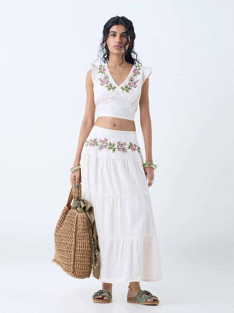Bring effortless charm to your warm-weather assortment with this off-white top from Bombay Paisley. Vivid floral embroidery is decked across the breathable fabric. while a flattering V-neck and flutter sleeves add a feminine touch. Finished with a flexible elastic waistband. this lightweight creation blends comfort with casual elegance.