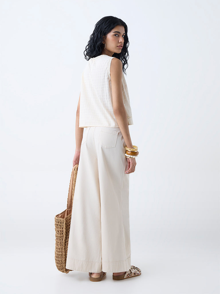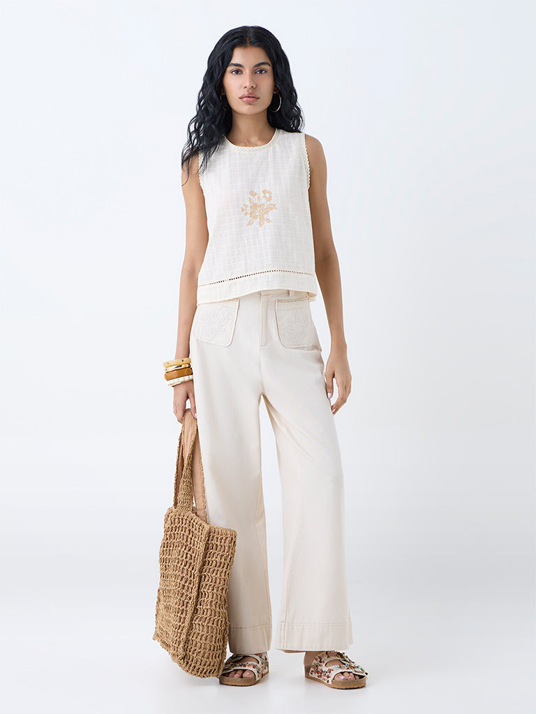 Add a hint of sophistication to your off-duty edit with this off-white cotton top from Bombay Paisley. Designed with a round neck and sleeveless cut. it showcases a subtle checkered pattern that serves as a soft canvas for delicate floral embroidery. Crochet trims along the hemline add artisanal charm. lending a handcrafted finish to the silhouette.