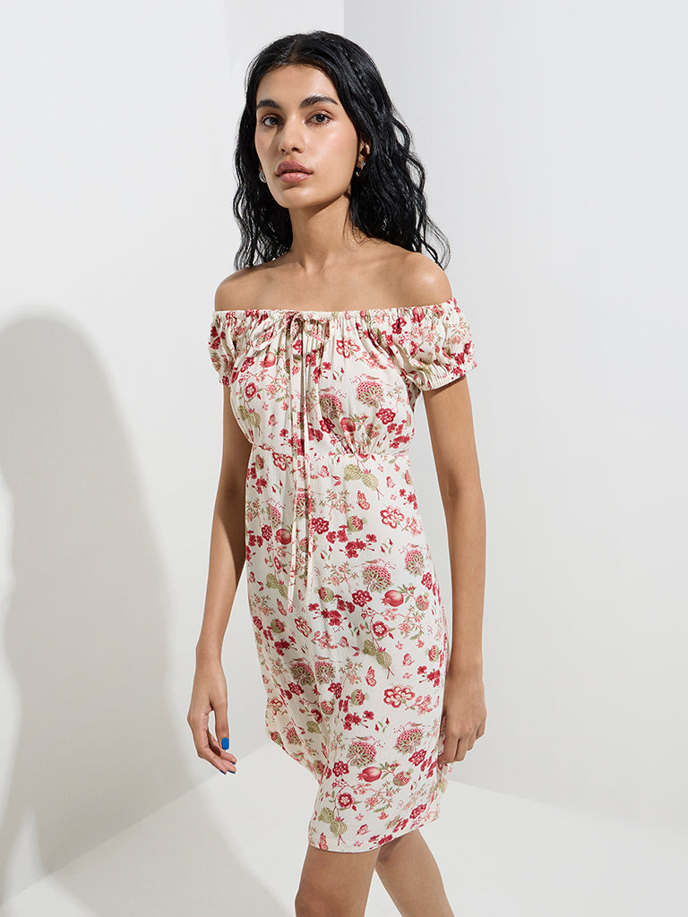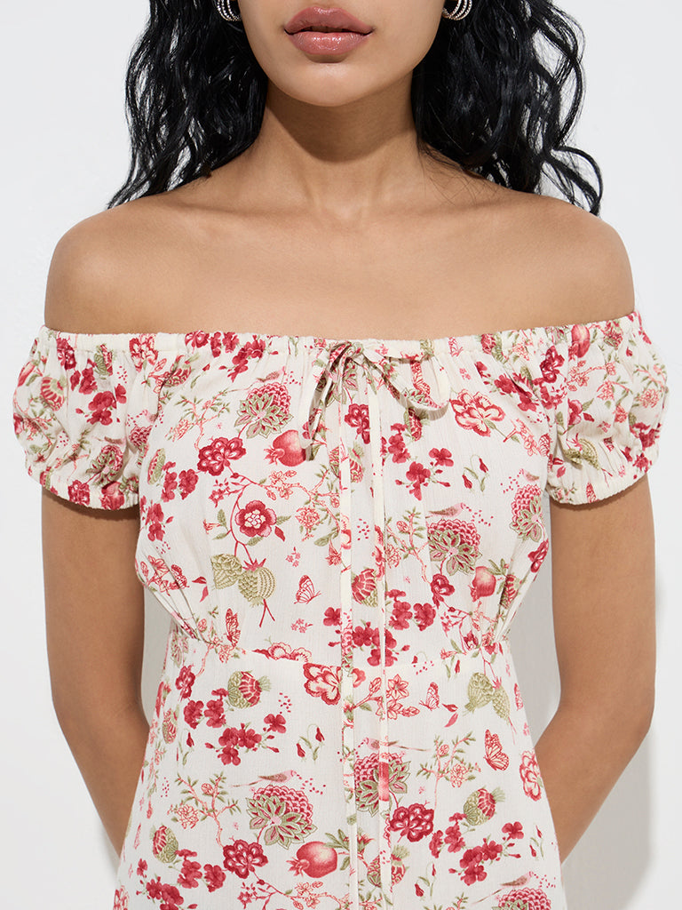 This off-white dress by Bombay Paisley is designed with appealing floral prints in red. Made from soft and breathable fabric. the A-line garment boasts an off-shoulder. knot design and short sleeves.