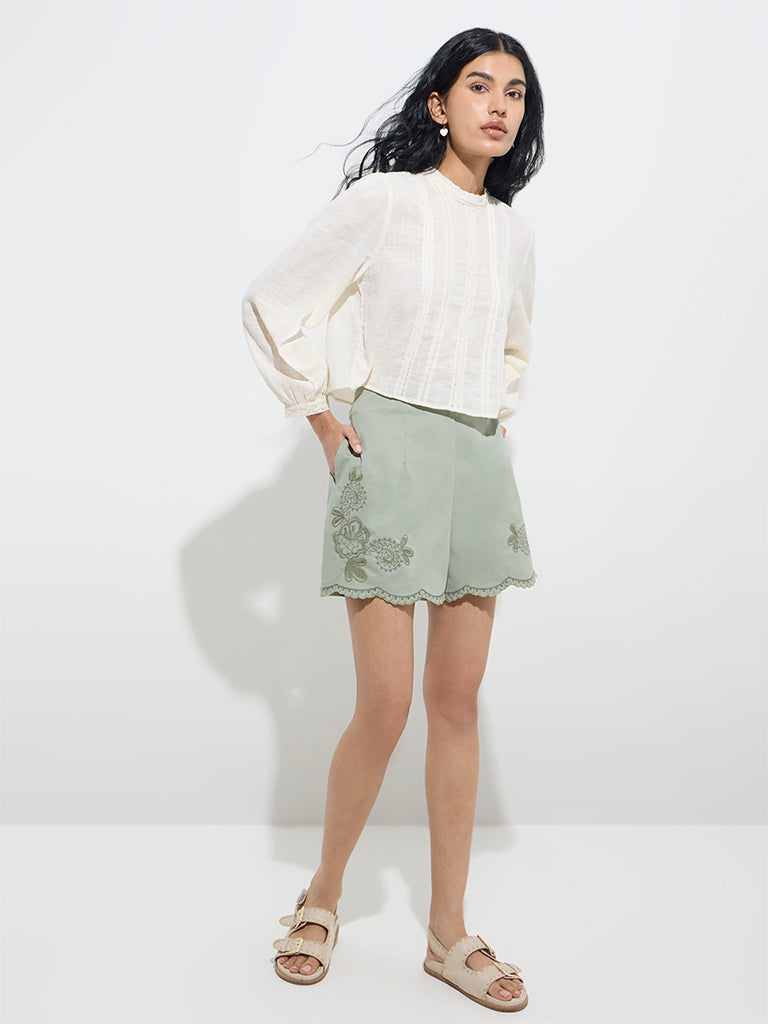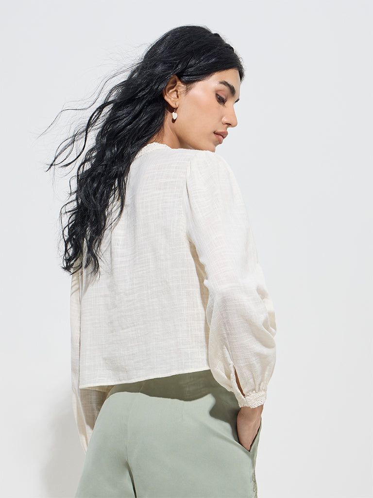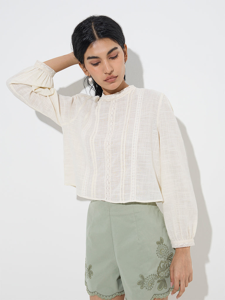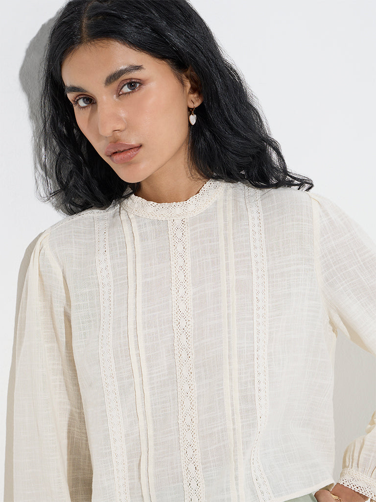 Bombay Paisley unveils this off-white top styled with classic lace embroidery and pintuck detailing. It includes a round neck and full sleeves for a charming look.