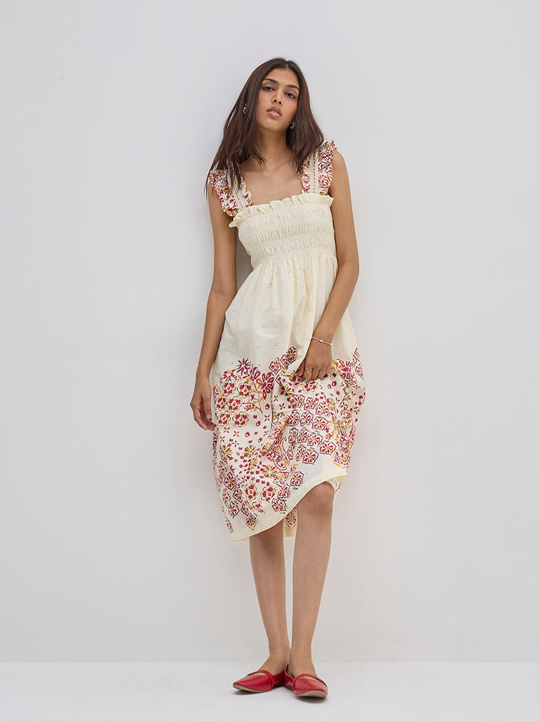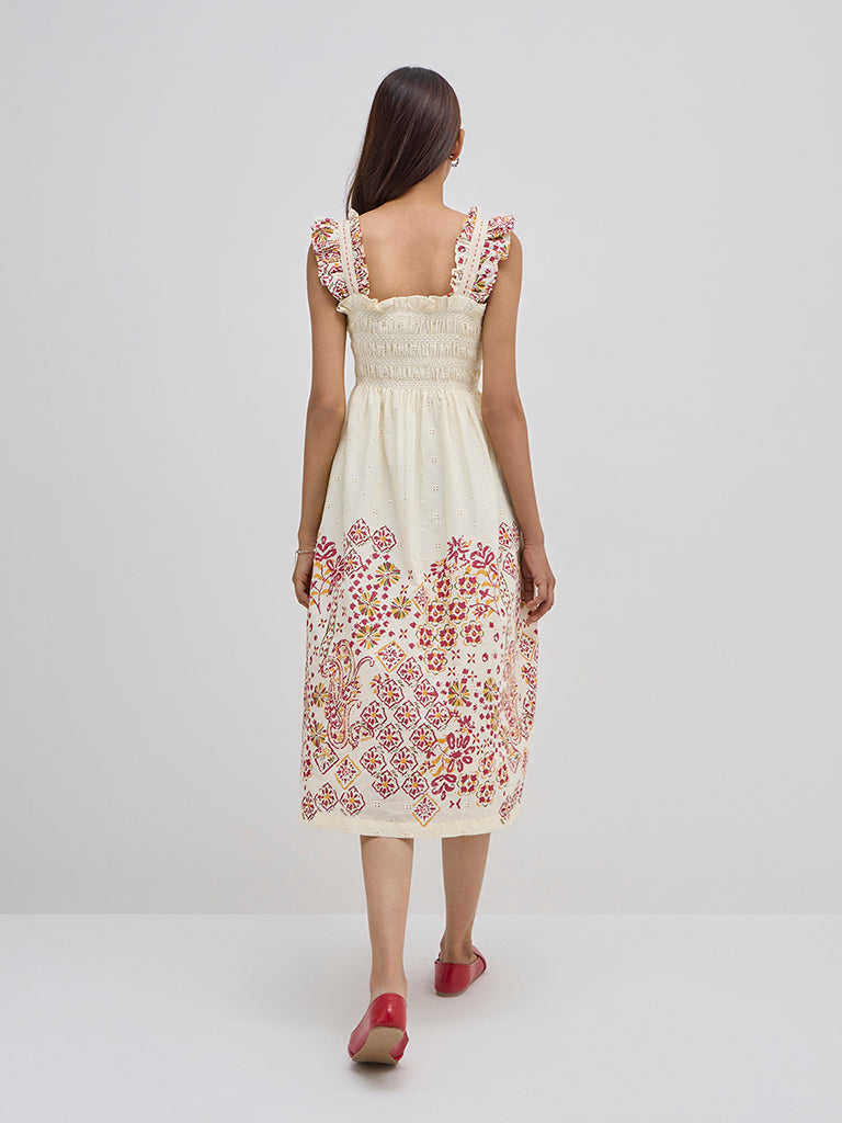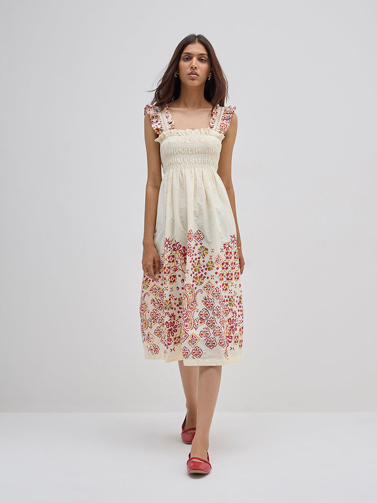 Fashioned in an A-Line silhouette. this off-white dress from Bombay Paisley features schiflli designs coupled with floral prints. Its pure-cotton built ensures easy comfort. while the smocked bodice. square neck. and ruffled sleeves lend a stylish finishing touch.