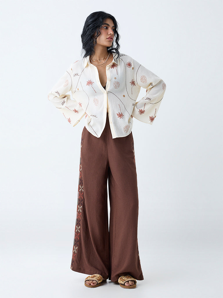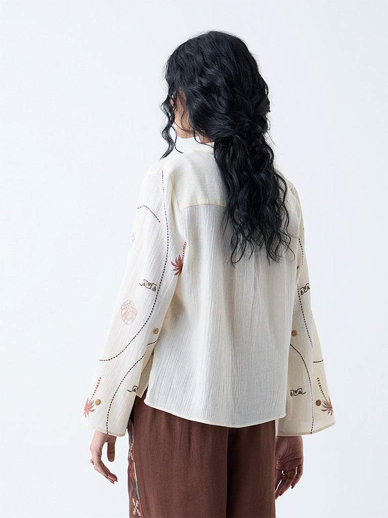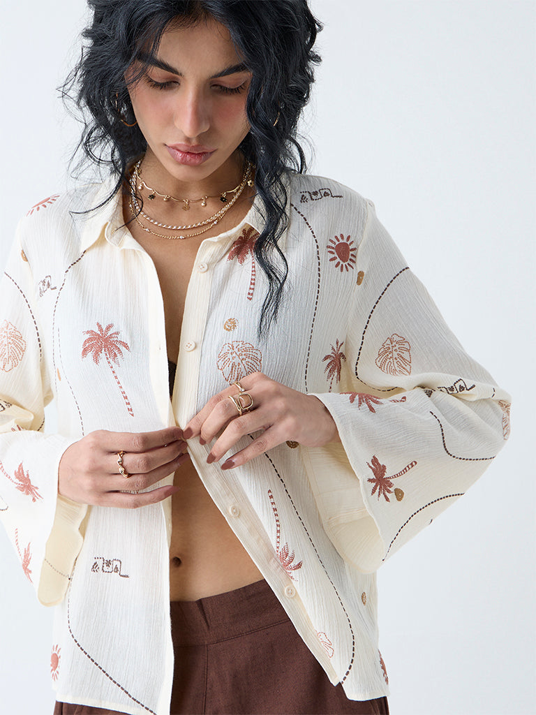 This off-white shirt from Bombay Paisley brings tropical energy to your wardrobe with its vibrant print. Cut from pure cotton. it’s styled with a structured collar and button-down front. while bell sleeves add a playful twist.