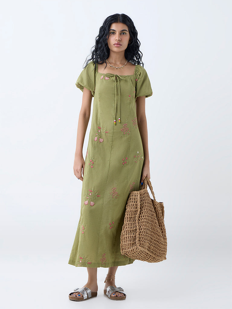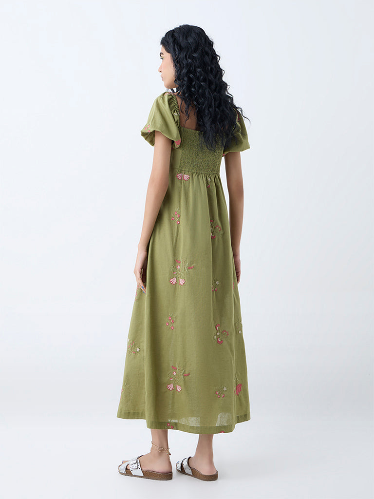 Boost your holiday edit with this olive dress by Bombay Paisley. Adorned with eye-catching floral motifs. it is shaped in an A-line silhouette and made from a premium cotton-blend fabric. The square neck. puff sleeves. and smocked back ensure an effortless fit. while convenient side pockets add a practical finish.