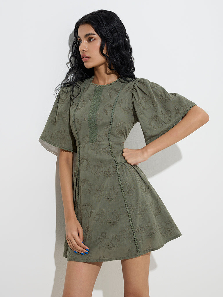 Bombay Paisley Olive Floral Embroidered Cotton A-Line Dress