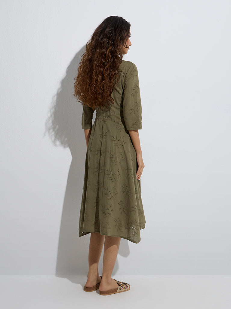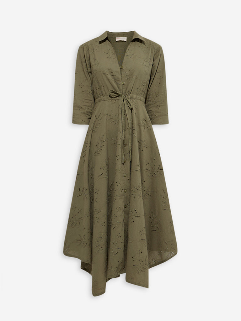 Bombay Paisley introduces this olive dress adorned with intricate schiffli detailing. Spun from pure cotton. it features a V-neck collar extending to a button placket and three-quarter sleeves. The drawstring waist adds a customizable fit. defining the silhouette with effortless charm.
