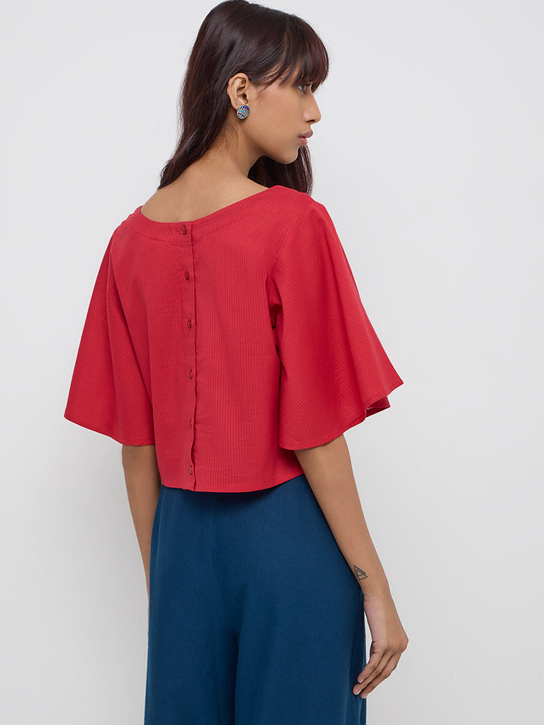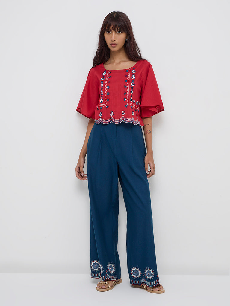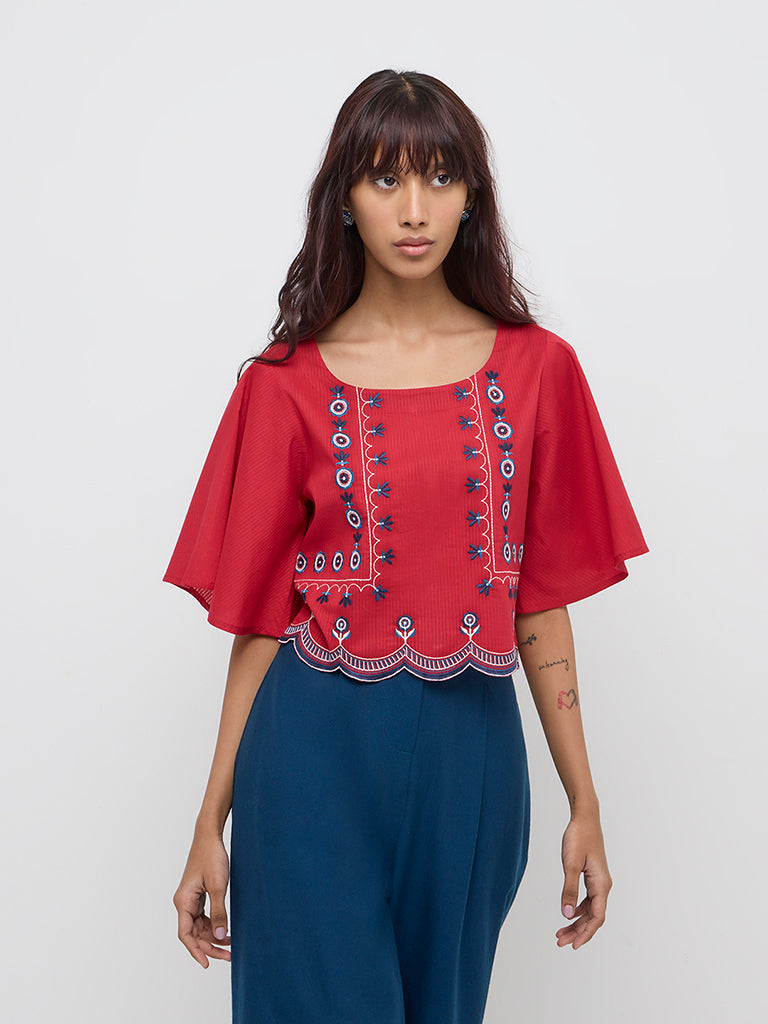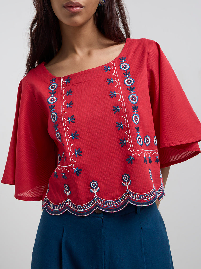 This red top from Bombay Paisley is adorned with intricate embroidered detailing. Made from a cotton-rich fabric. it showcases a crewneck and angel sleeves. The scalloped hemline lends a flattering look.