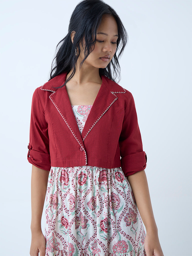 This red dress from Bombay Paisley captures an easy-going yet graceful vibe with its tiered silhouette and floral patterns. Cut from a cotton-rich fabric. it comes fitted with a square neck and adjustable shoulder straps. while the smocked back ensures a custom fit. The coordinated jacket is designed with a notched lapel and full sleeves. adding structure to the otherwise breezy ensemble.