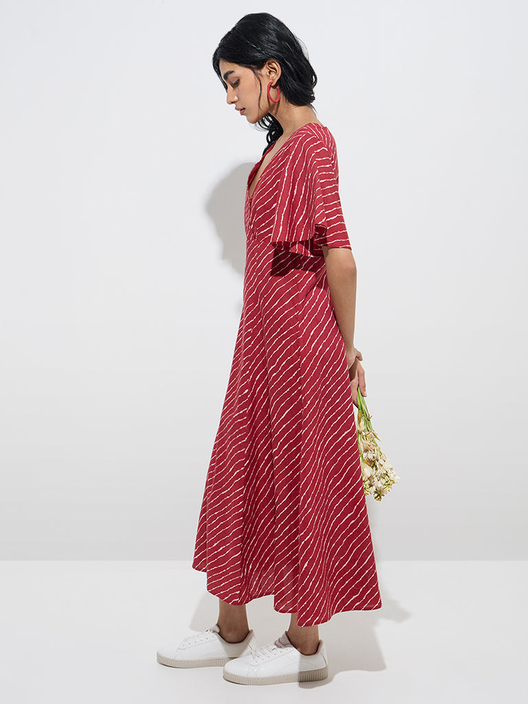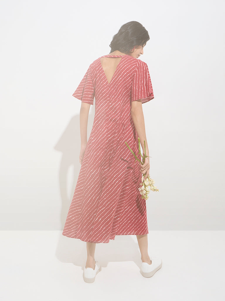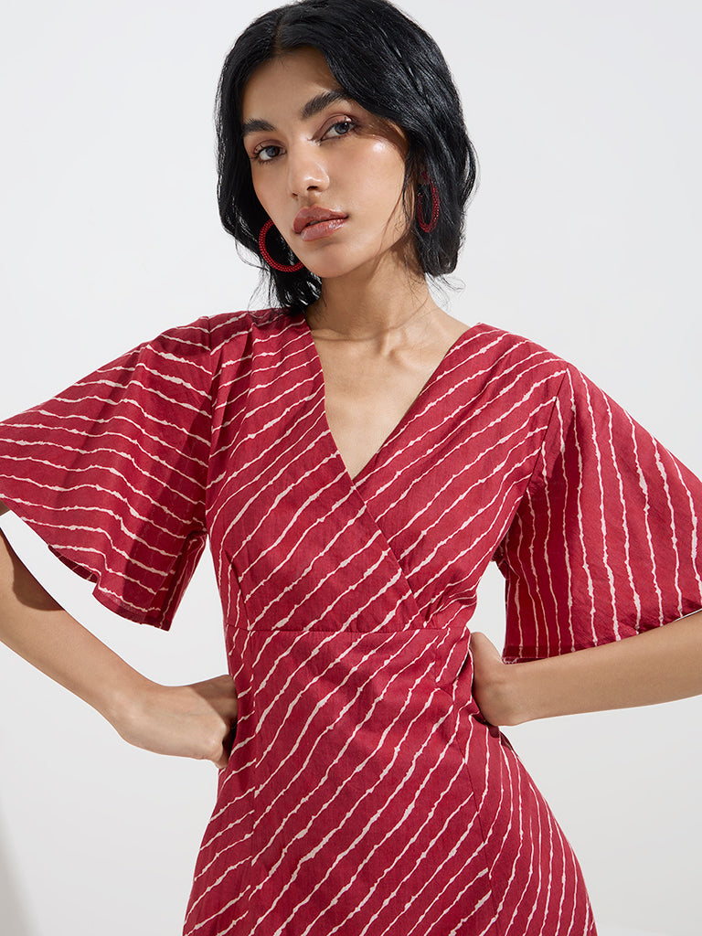 This red dress by Bombay Paisley is fashioned in a tie-dye profile. Craved in an A-line silhouette. the soft and breathable fabric garment carries a wrap-style V-neck and angel sleeves.