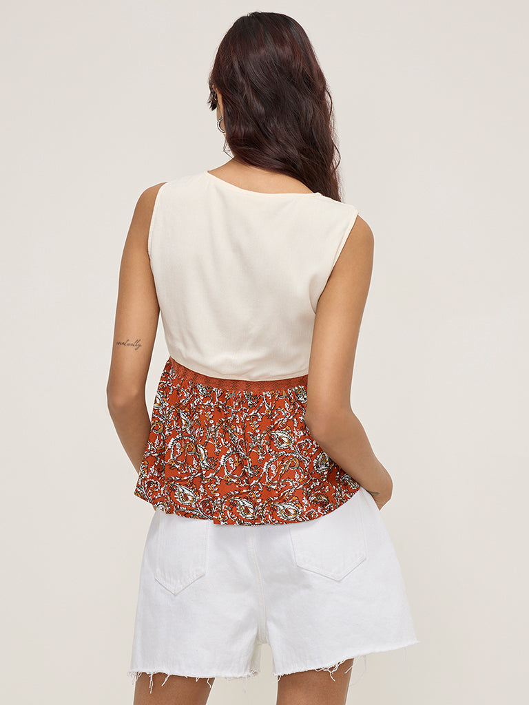 This rust top by Bombay Paisley is a flattering combination of embroidery and paisley prints. Made with quality fabric. it features a pleated bodice. a V-neck and a sleeveless cut.