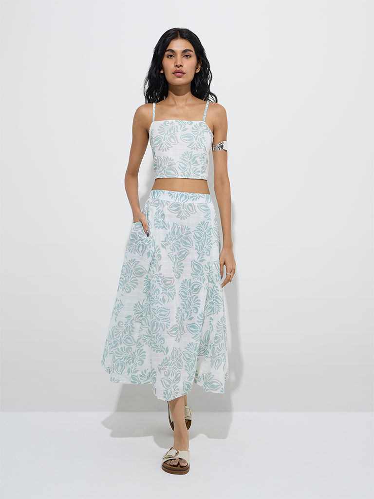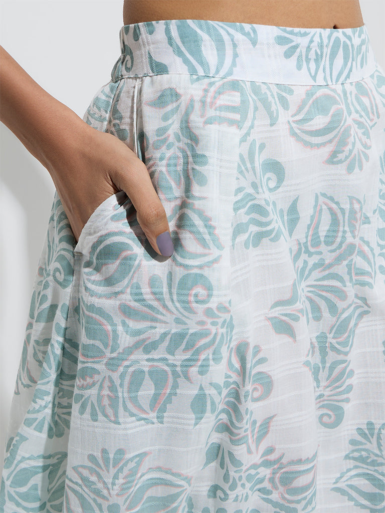 This sage skirt from Bombay Paisley is adorned with intricate botanical prints. offering a nature-inspired touch. Created from pure cotton for all-day comfort. it’s designed with an elastic waistband for a comfortable fit. The addition of side pockets enhances its practicality.