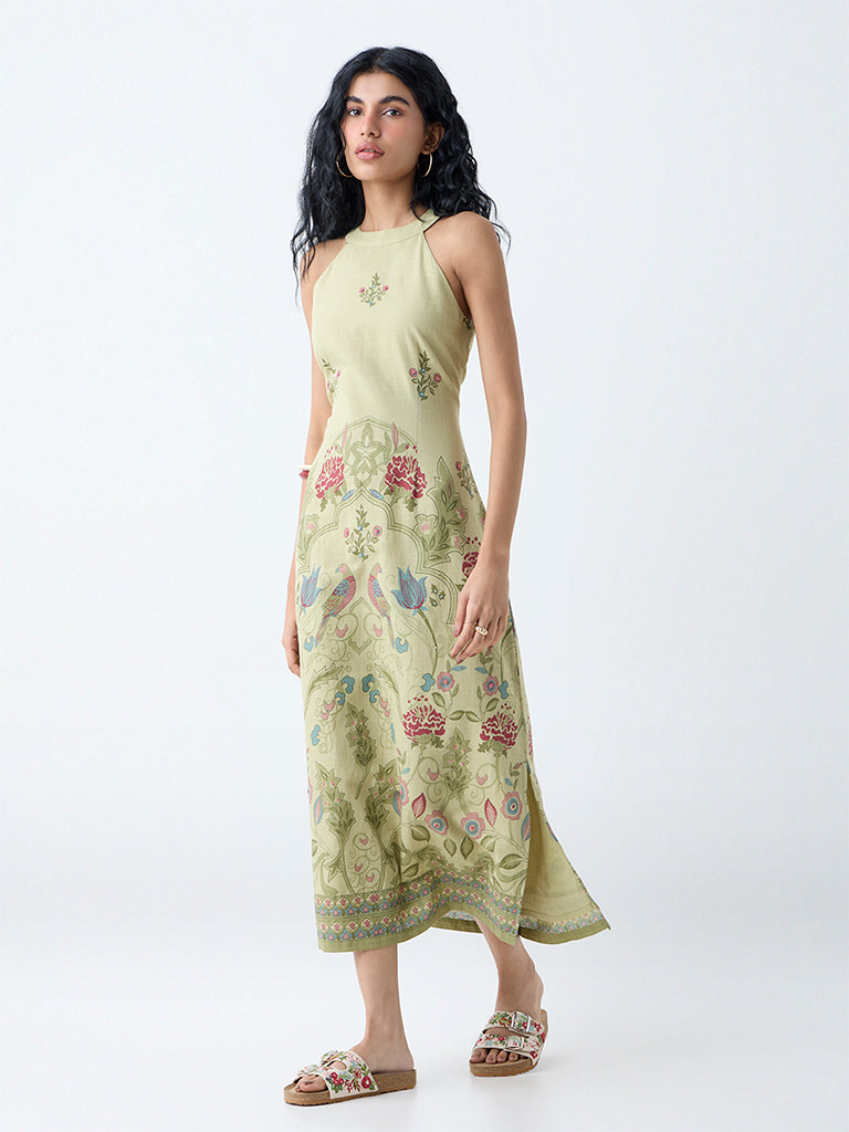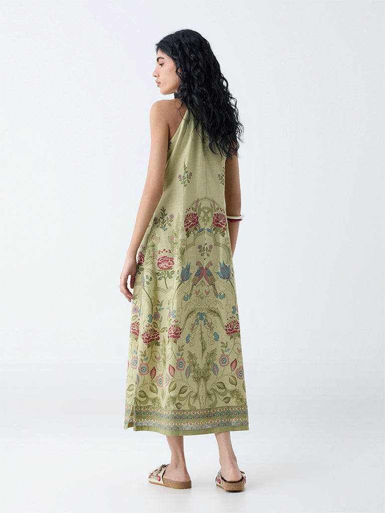 This sage dress from Bombay Paisley is made for days in the sun. Constructed from pure cotton in an A-line silhouette. it showcases botanical motifs and a halter neck that create a chic look. Pair it with strappy sandals and a woven tote for an easy daytime look.