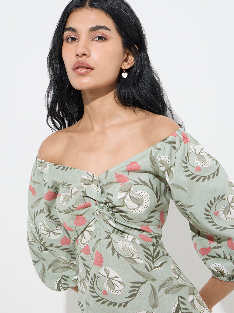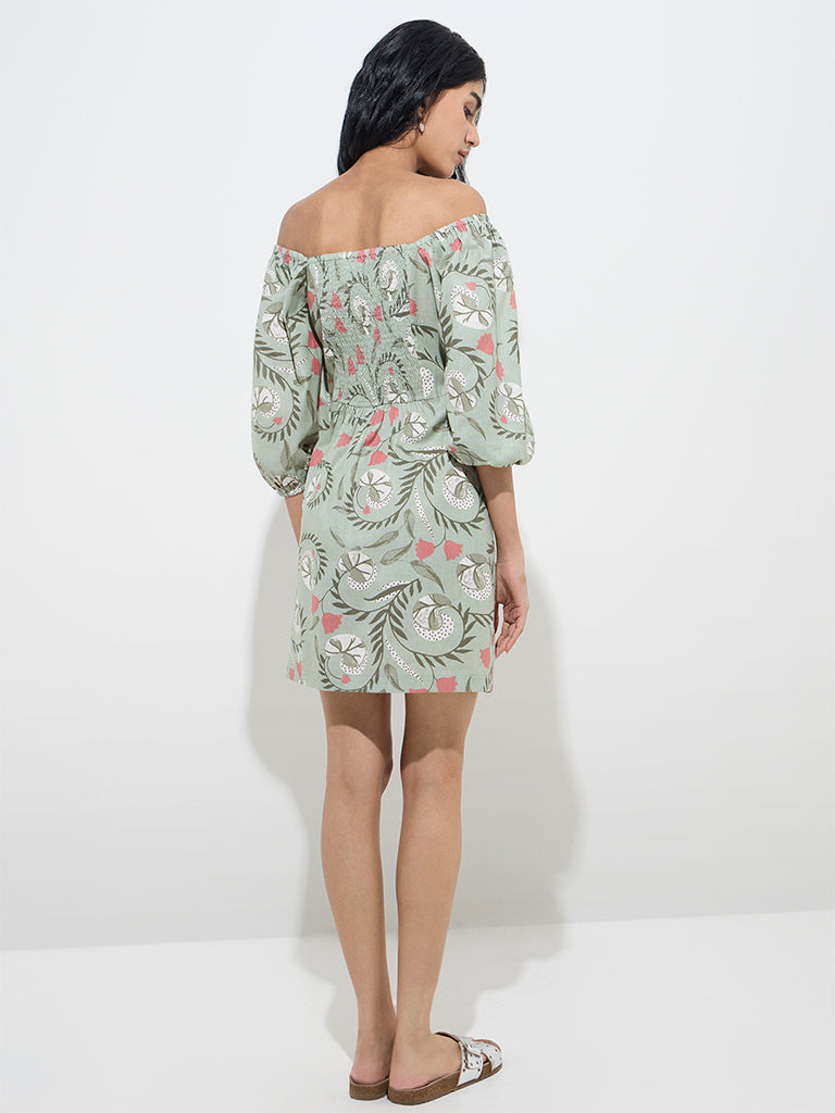 Bombay Paisley presents this sage dress adorned with pleasing floral prints. The pure cotton A-line garment flaunts knot-detailing on the bust. Its off-shoulder neck and puff sleeves are well supported with smocked design at the back for a convenient fit.