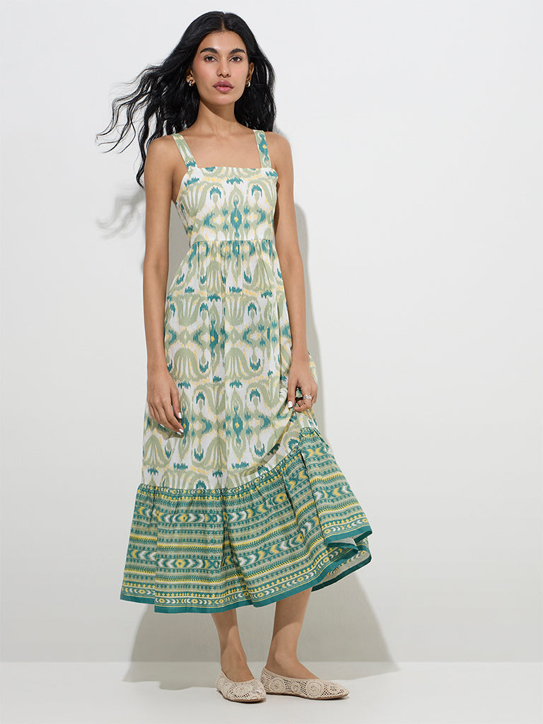 This sage dress from Bombay Paisley showcases a distinctive Ikat print on a pure cotton fabric. Framed in a tiered silhouette. it features a square neck. adjustable straps. and a smocked back for a flexible fit. A coordinating jacket completes the ensemble. adding the perfect finishing touch.