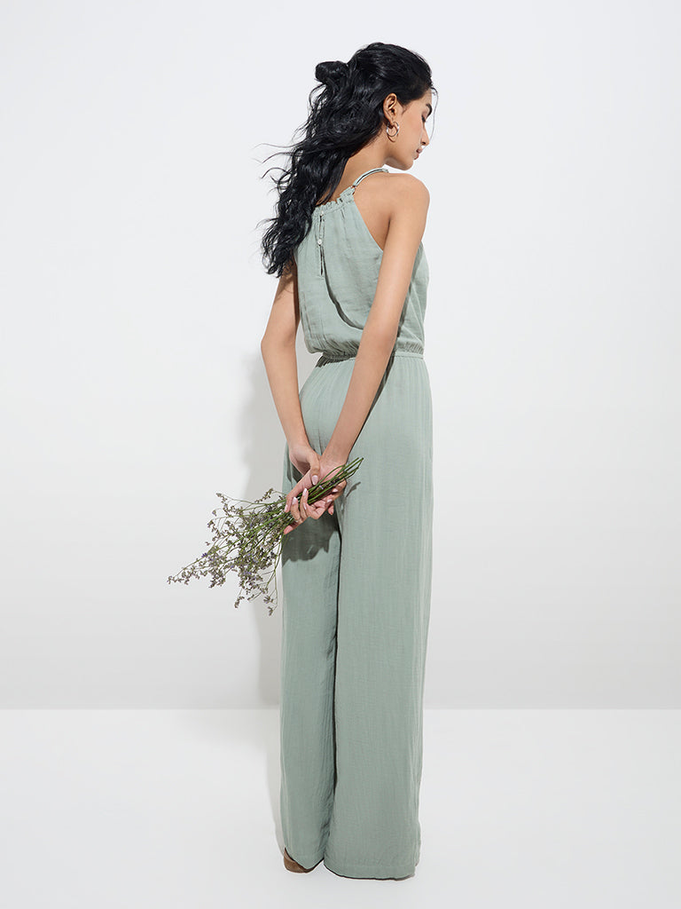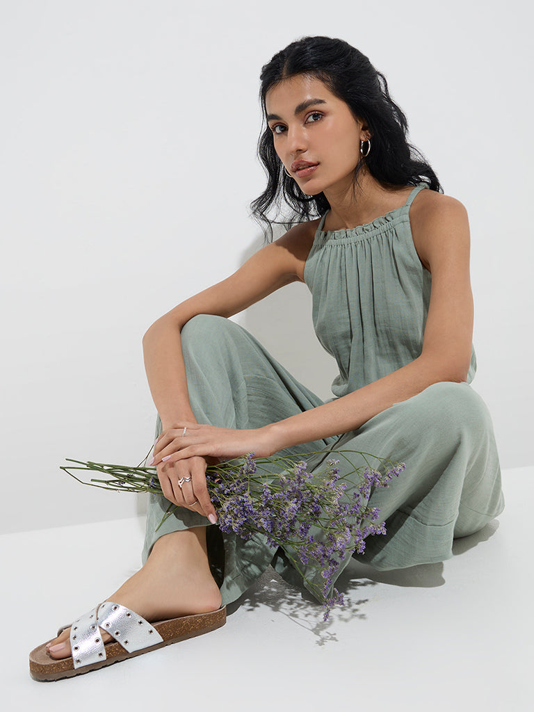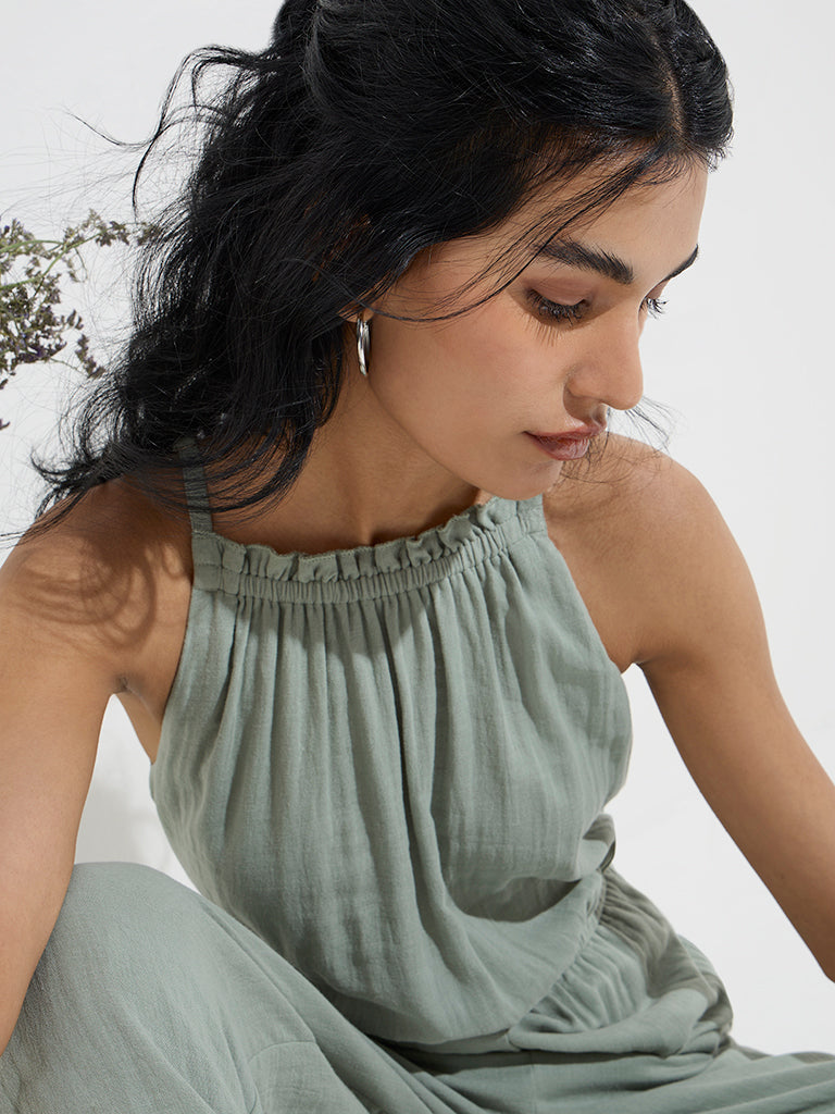 Bombay Paisley brings you this sage jumpsuit in a crinkle-textured profile. Made from a cotton-rich fabric. it carries a ruffled neck and a sleeveless cut.