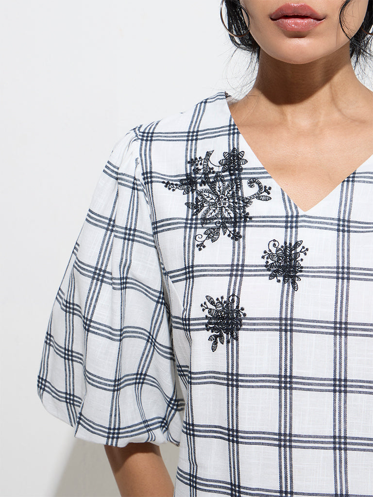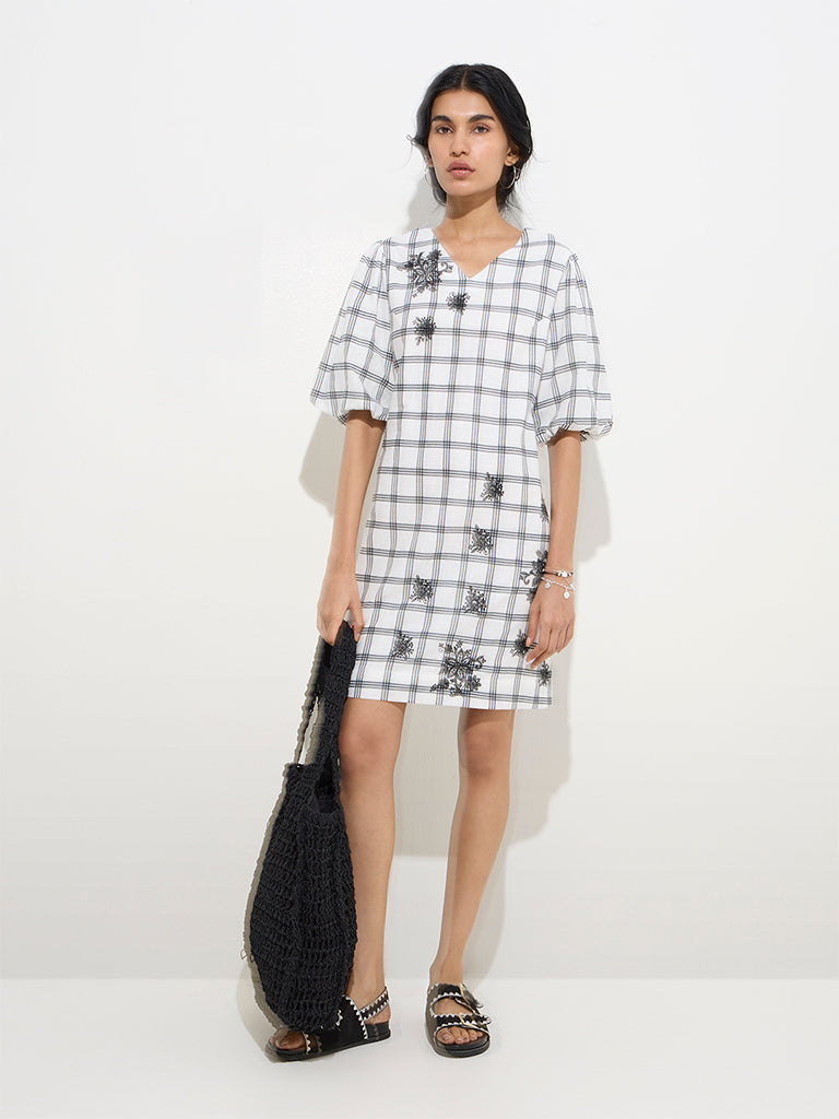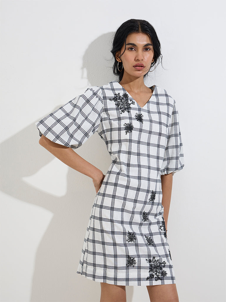 Bombay Paisley unveils this white straight dress. blending classic checks with delicate floral embroidery. Crafted from pure cotton. it features a V-neckline and blouson sleeves for a touch of effortless elegance.