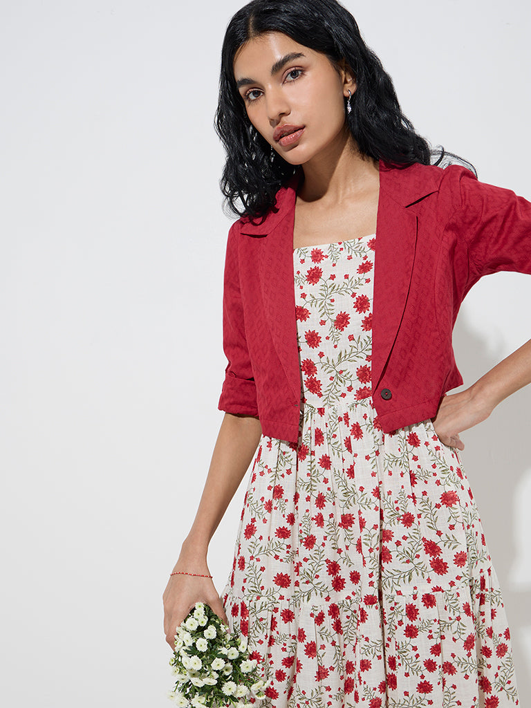 Bombay Paisley unveils this white dress featuring pleasing floral prints in red. Made with pure cotton. the garment has elegant tiered detailing. It is structured with a square neck and a sleeveless cut. The complementary red jacket designed with self-embroidery elevates the look of this dress. It is completed with a notched collar. single button closure and full sleeves.