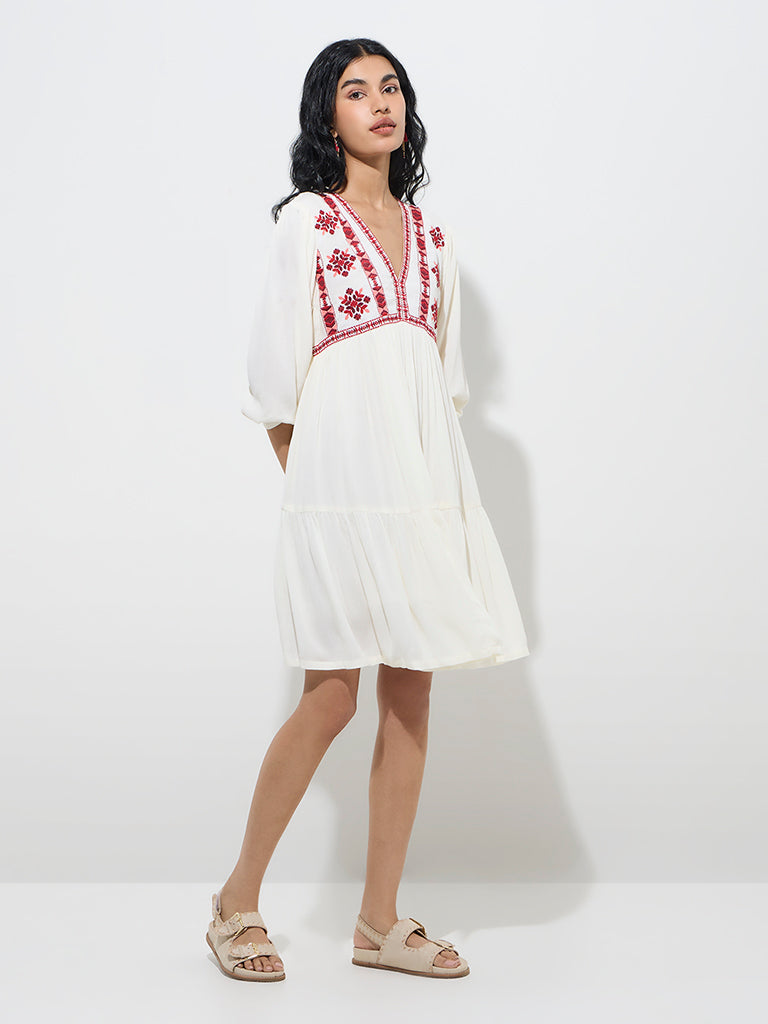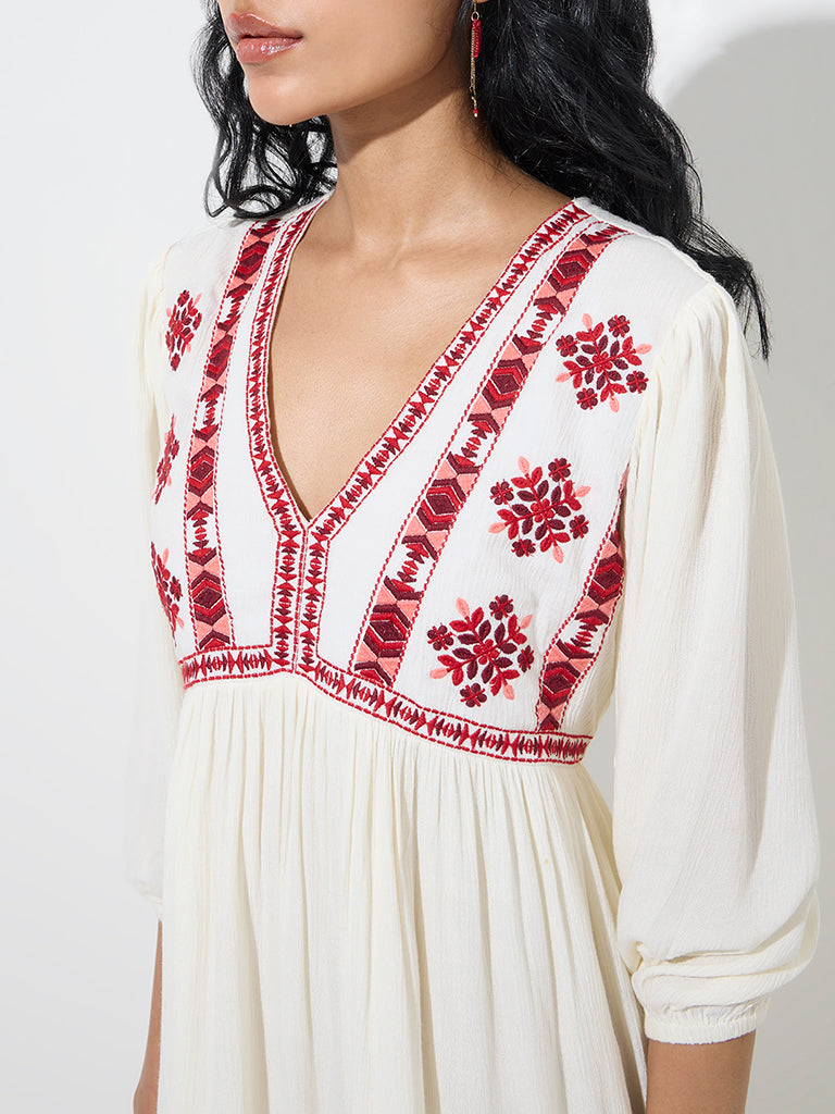 Bombay Paisley brings you this white dress designed with striking red floral embroidery in the bodice. The breathable fabric garment features a tiered silhouette and gathered detailing that creates a playful look. It is completed with a V-neck and blouson sleeves.