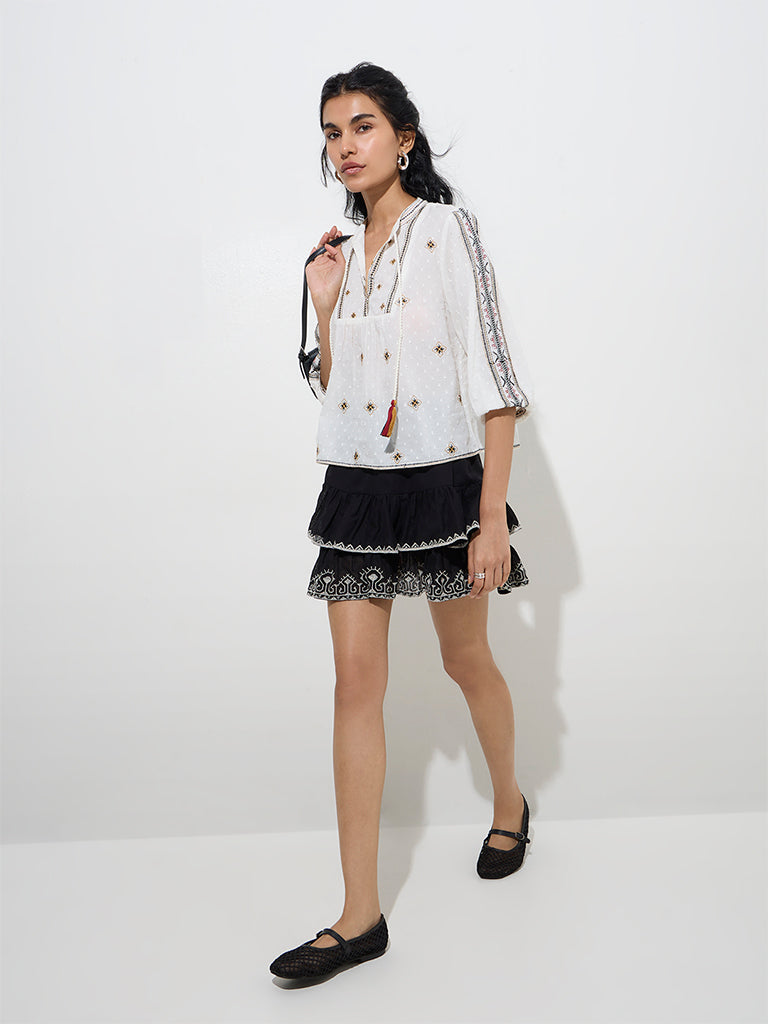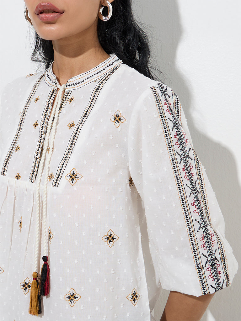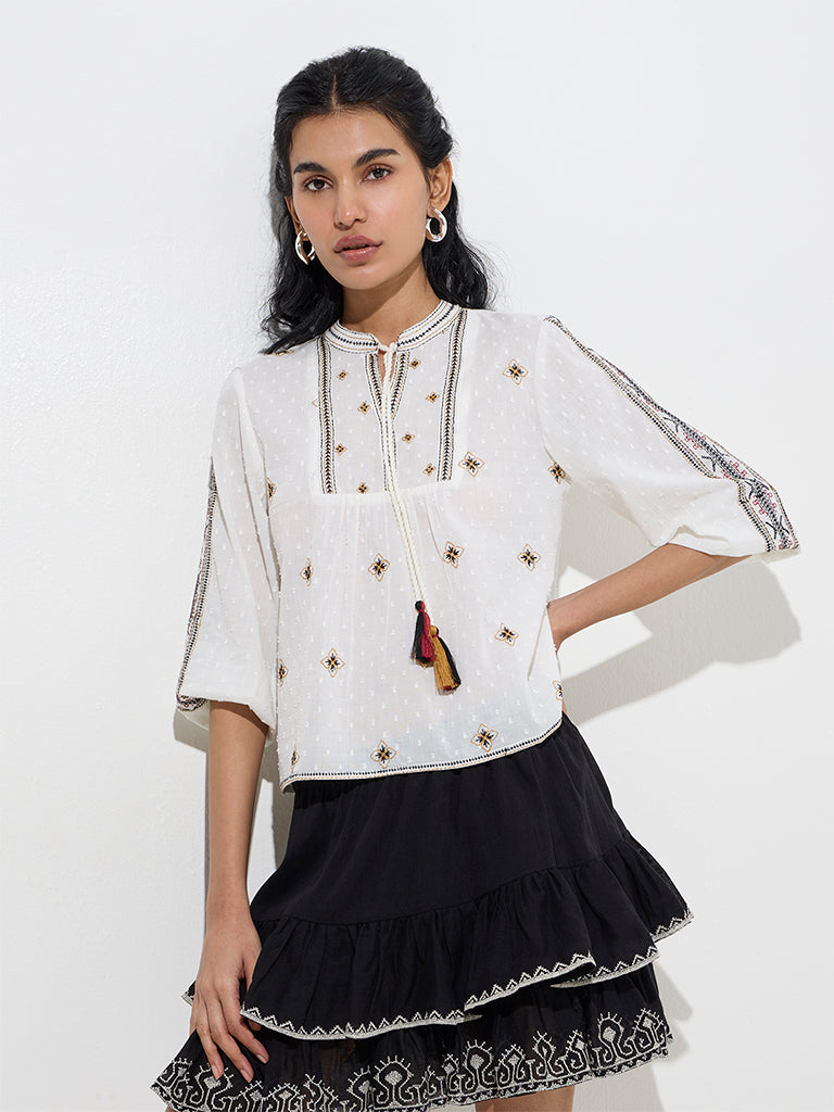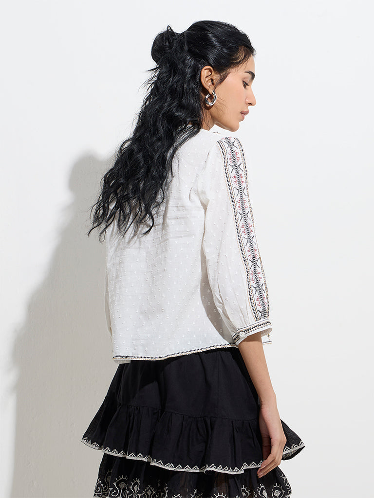 Bombay Paisley presents this white cotton top. featuring a charming Swiss dot design with intricate embroidery. Styled with a knot-detailed band collar and full sleeves. it blends elegance with a touch of vintage charm.