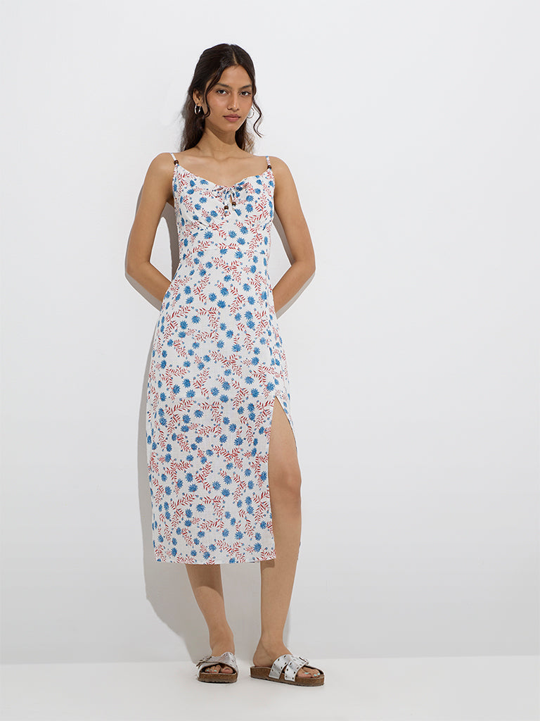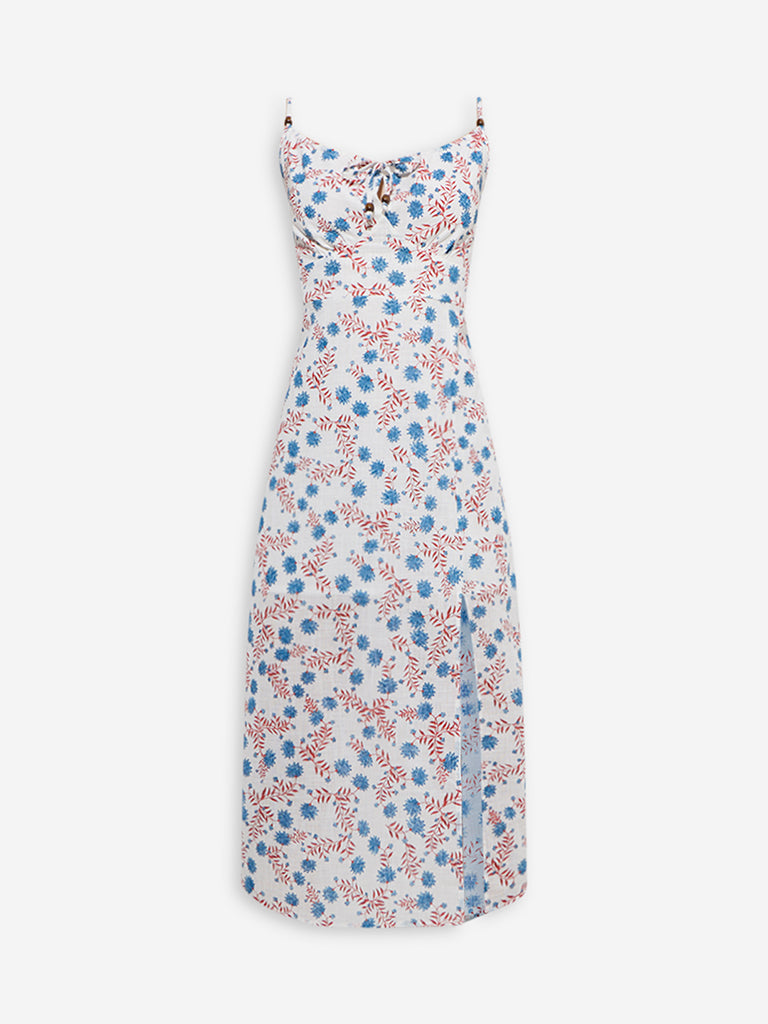 Bombay Paisley launches this white dress decked with floral motifs that enhance its feminine charm. Woven from pure cotton. it features a flattering V-neck with tie-up detailing. adjustable straps. and a smocked back for a comfortable fit. A slit at the front adds a sleek touch to the breezy silhouette.