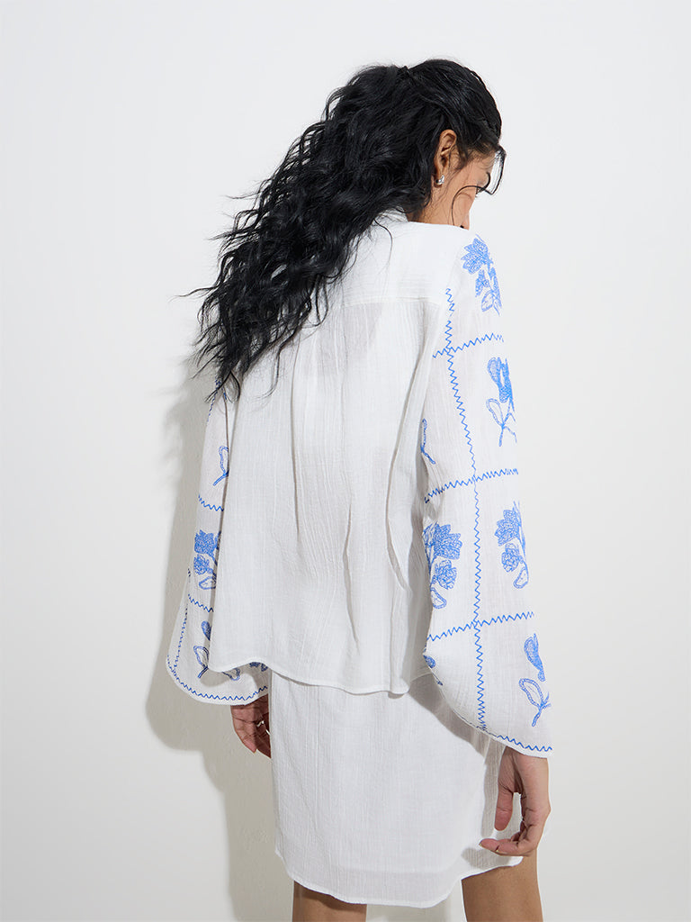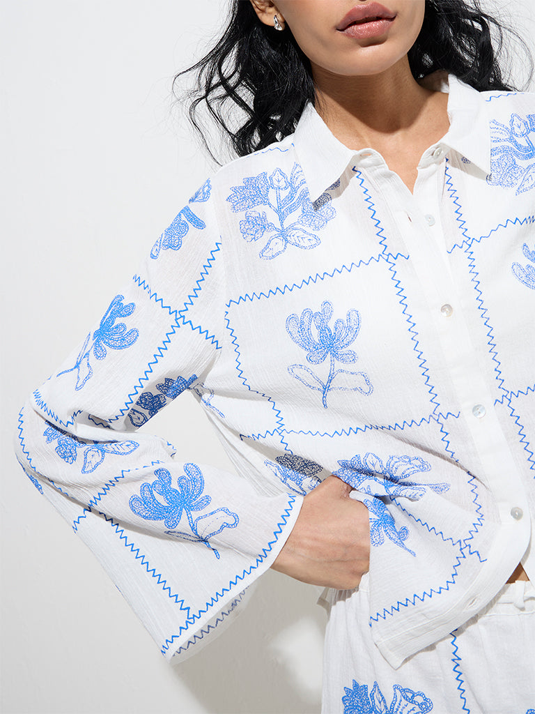 Bombay Paisley introduces this white cotton shirt. elegantly adorned with blue floral embroidery. Designed with a spread collar. button-down front. and full sleeves. it blends timeless charm with effortless sophistication.