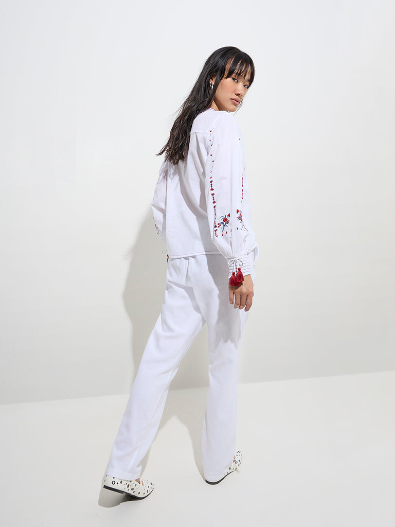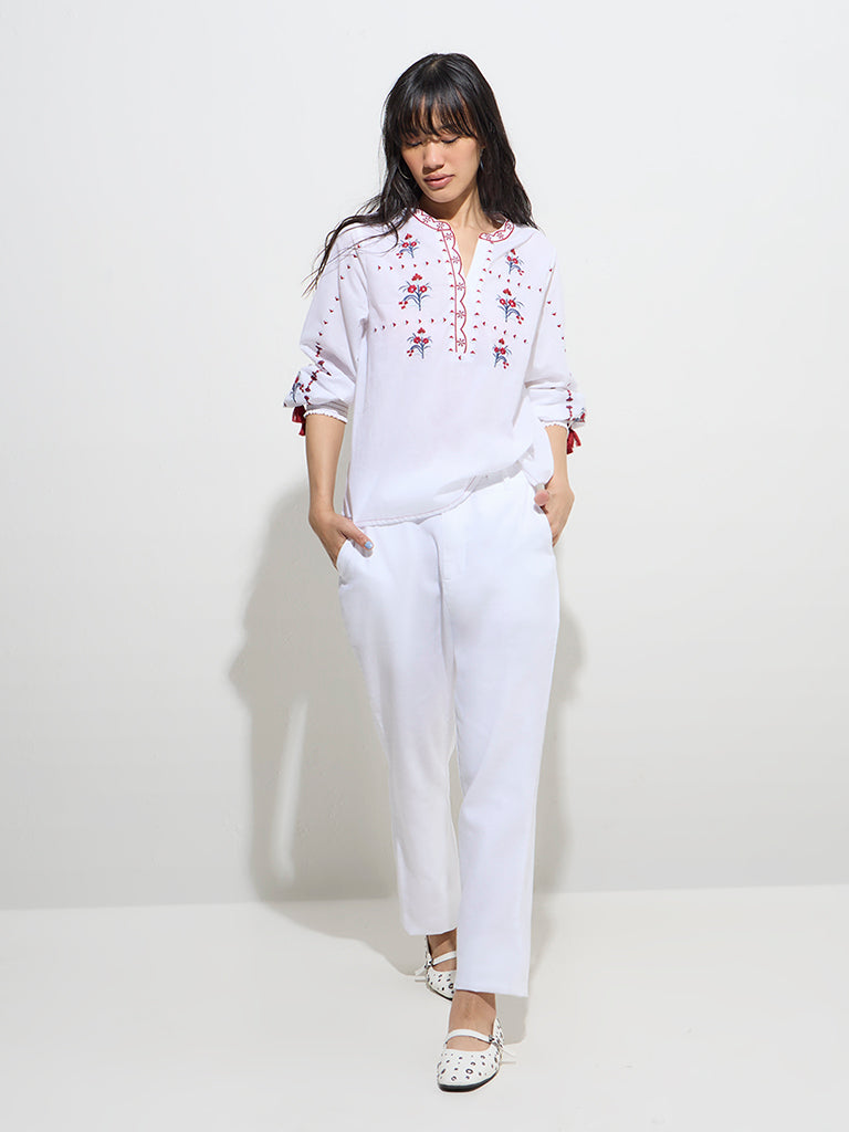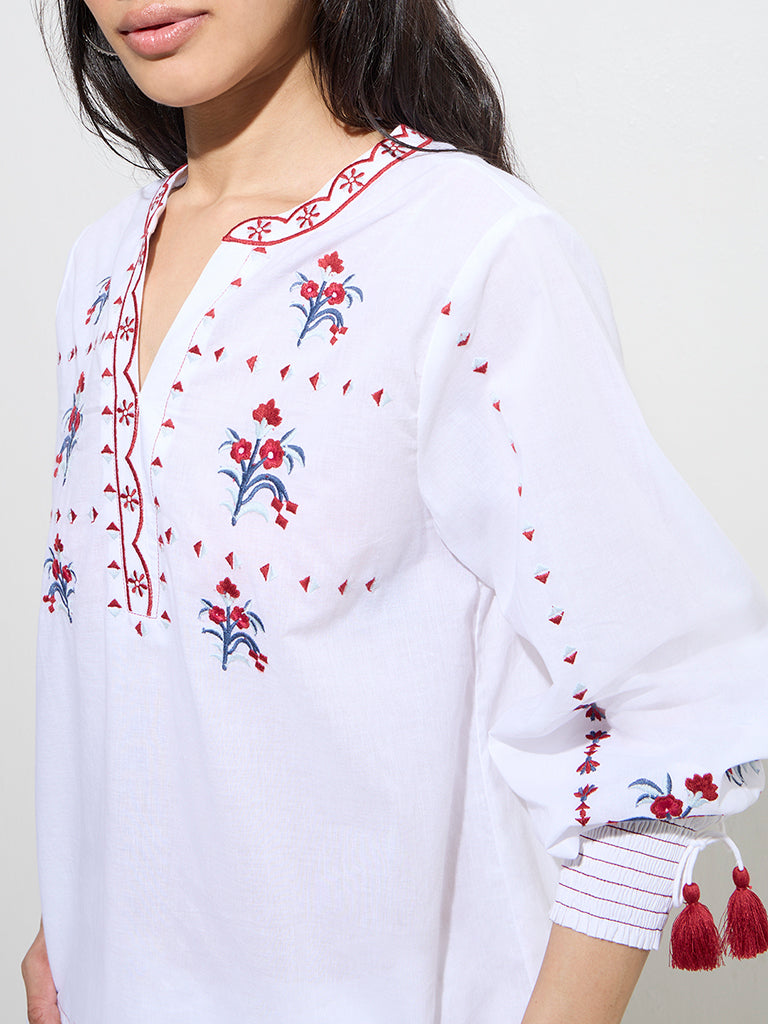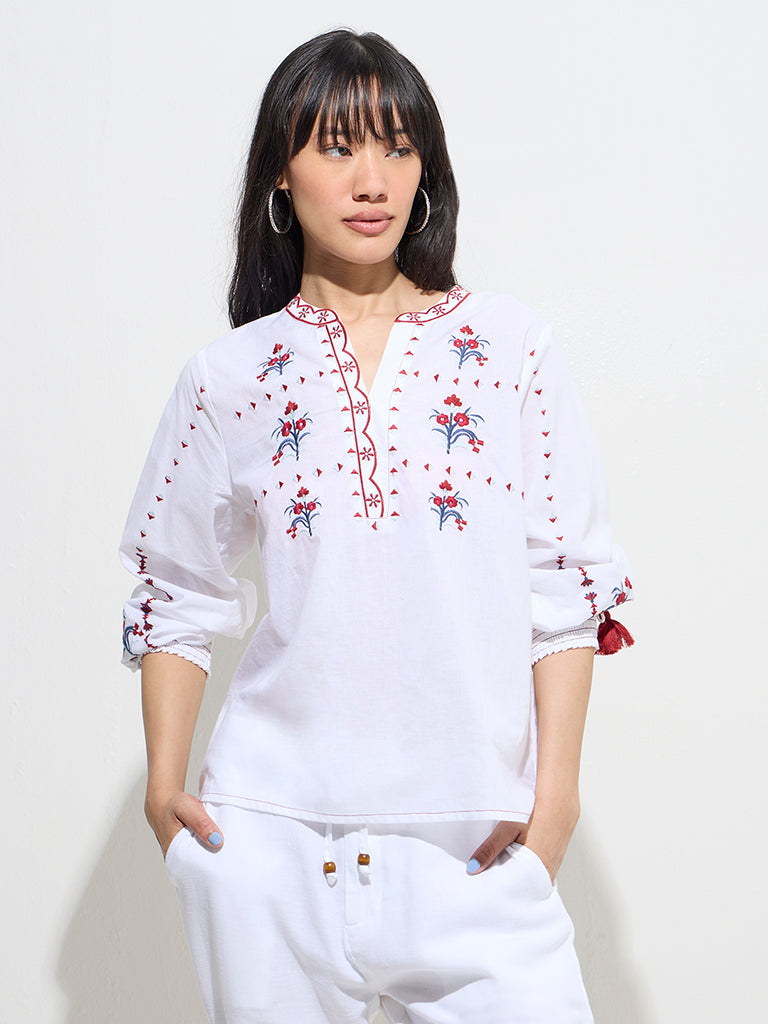 Bombay Paisley presents this white top. adorned with floral embroidery for a touch of elegance. Crafted from pure cotton. it comes with a notched neckline and breezy peasant sleeves. finished with delicate tassels for added charm.