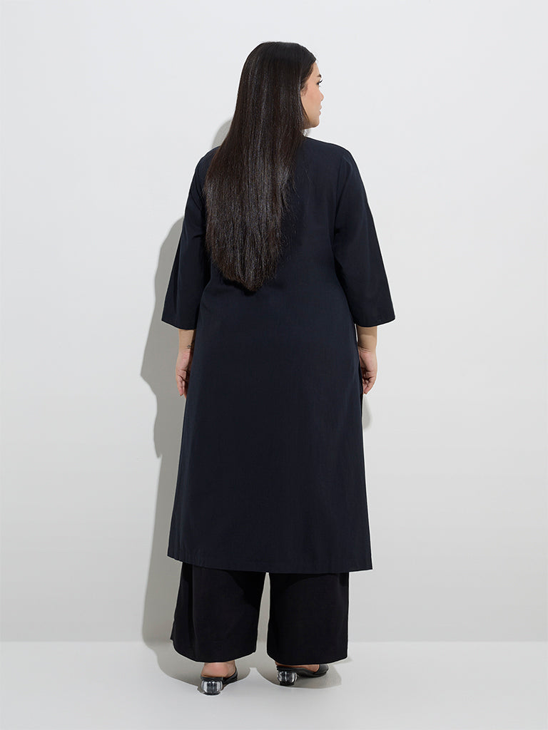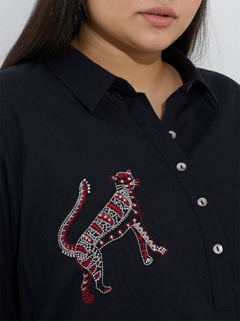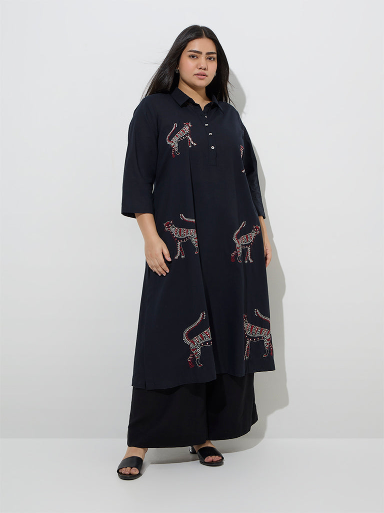 This black kurta from Diza spotlights animal-themed embroidery for a striking touch. Tailored from a rich linen-blend fabric. it flows effortlessly in a graceful A-line silhouette. A structured spread collar. three-quarter sleeves. and functional side pockets complete the design.