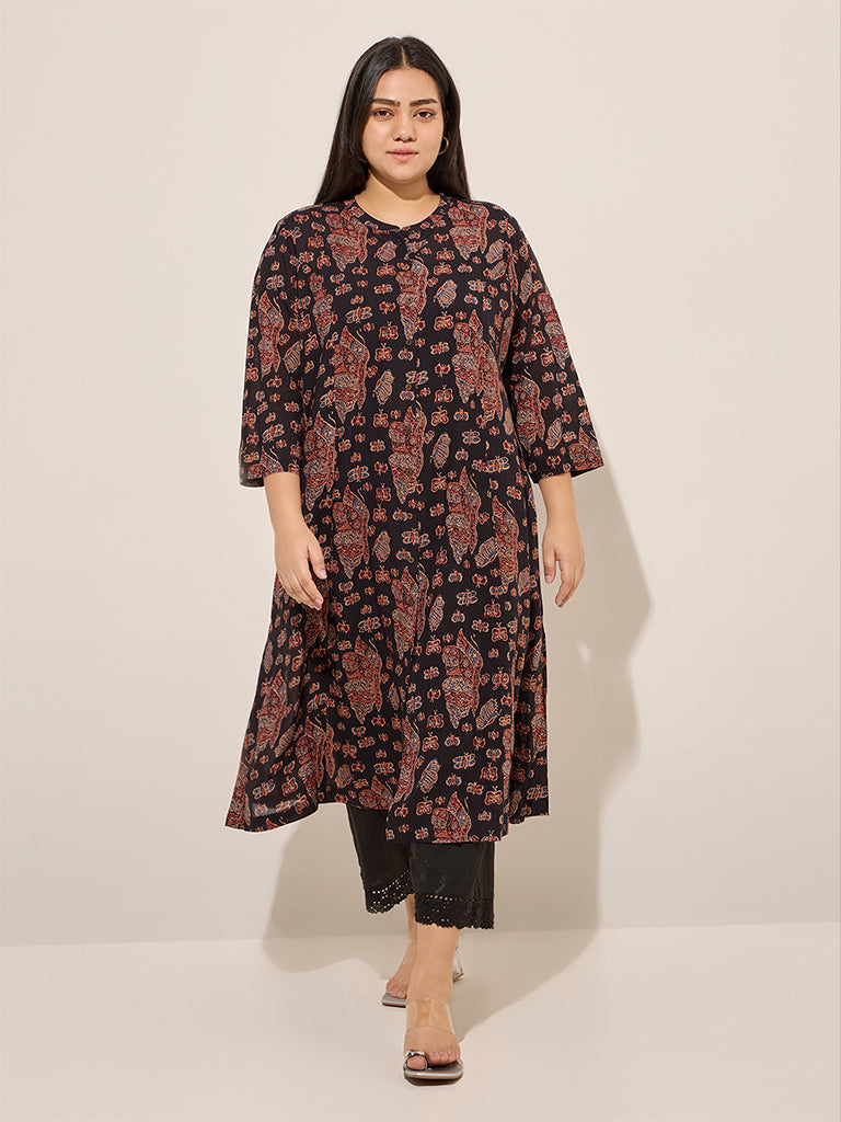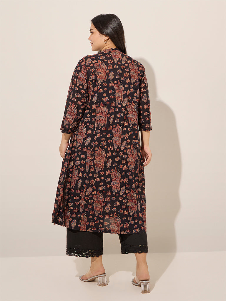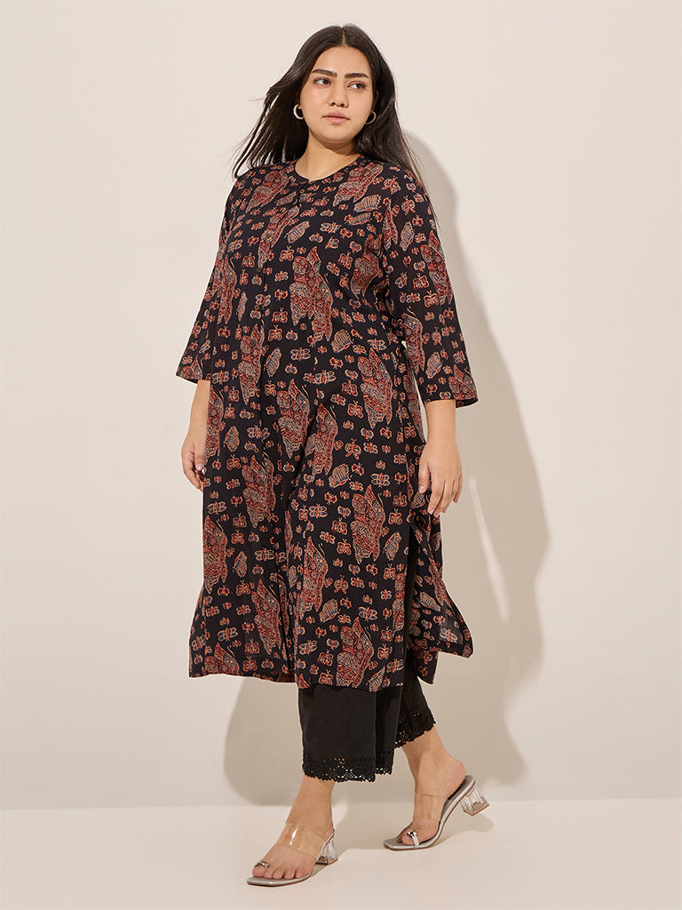Diza Black Ethnic Printed Cotton A-Line Kurta