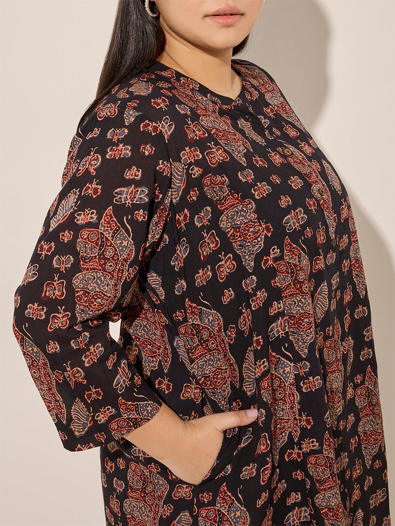 This black kurta by Diza features unique printed fashion in an elegant A-line silhouette. It carries a band neck leading to a button down style. three-quarter sleeves and side pockets.