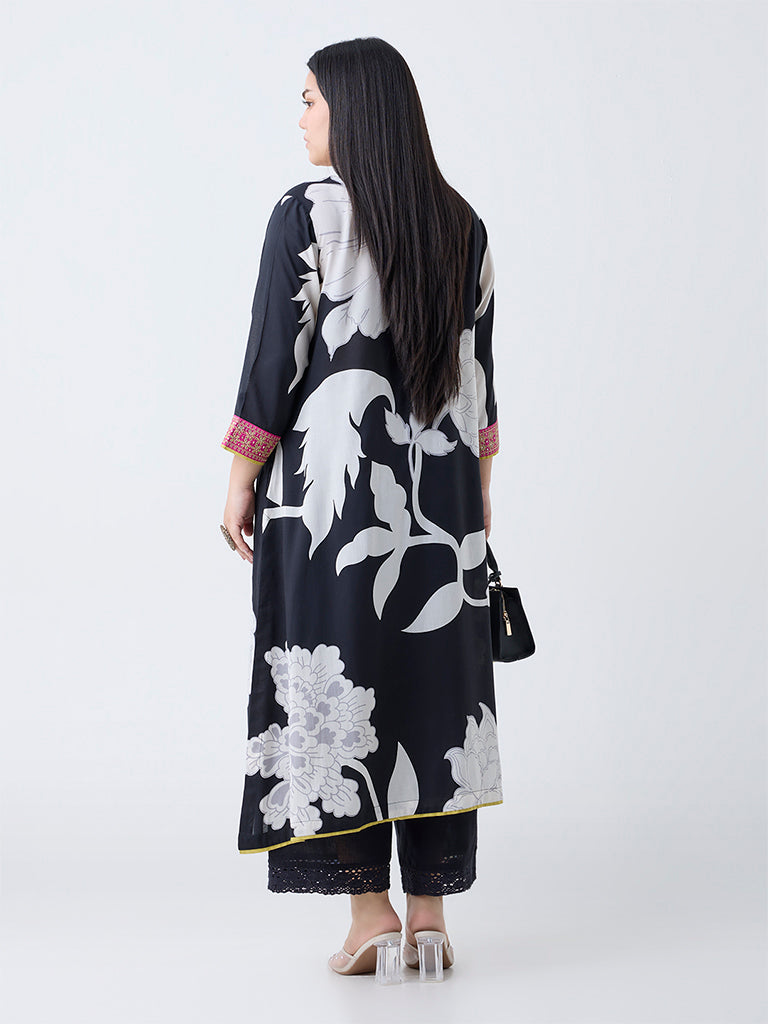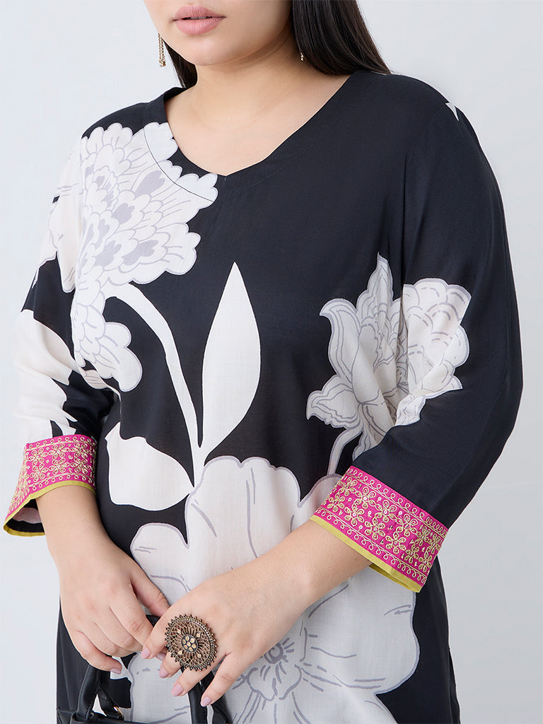 Make everyday ethnic wear extraordinary with this black kurta from Diza. showcasing eye-catching floral motifs that blend tradition with contemporary charm. Designed with a V-neck and three-quarter sleeves. it offers a flattering A-Line silhouette while remaining comfortable for all-day wear. Practical side pockets add a thoughtful touch of functionality. making it perfect for casual outings.